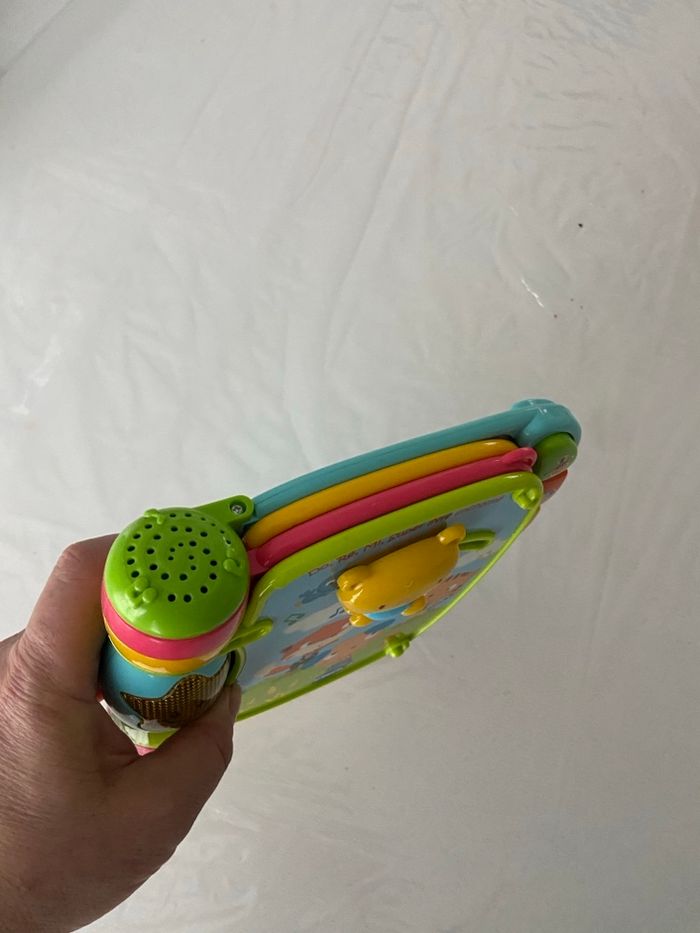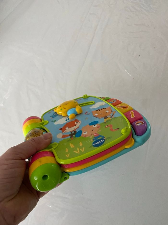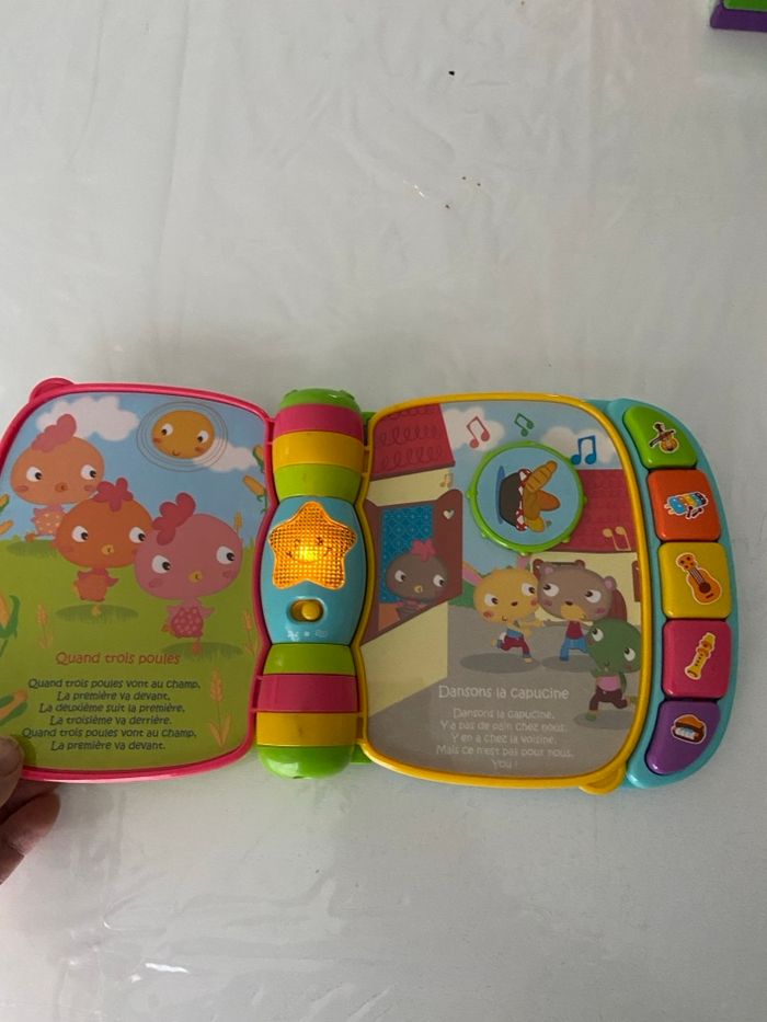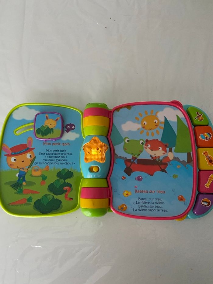 Vends livre interactif et musical VTech, idéal pour l’éveil des tout-petits dès 6 mois.