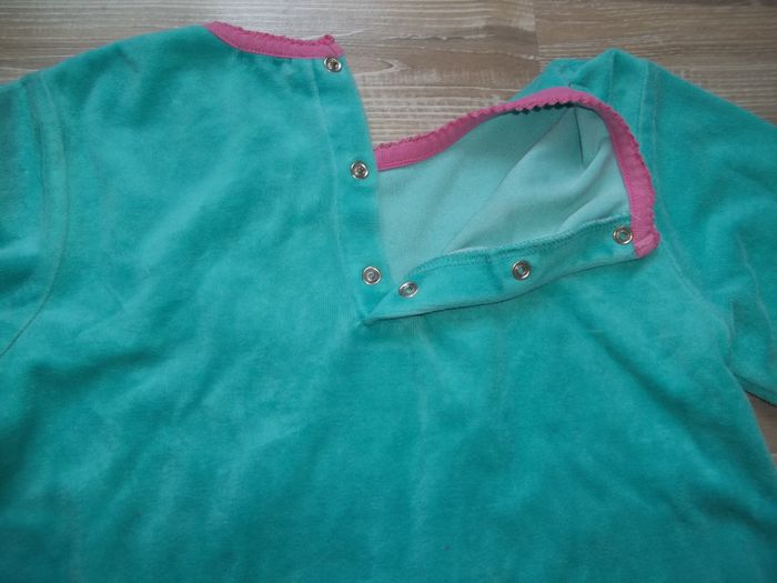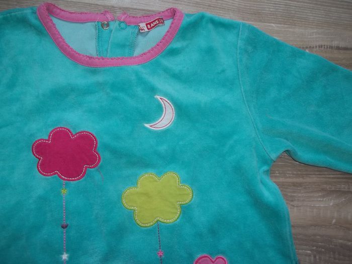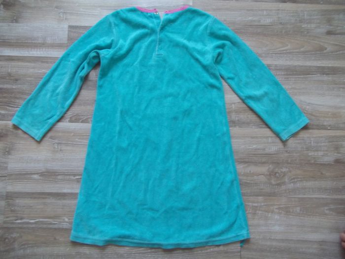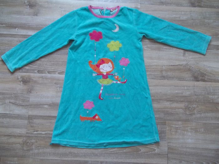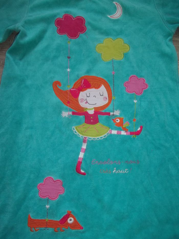 Chemise de nuit à manches longues et col rond, en velours ras bleu turquoise avec patchwork petite et son chien s'envolant avec des ballons "Envolons-nous très haut !". 80 % coton 20 % polyester. Ouverture dos (14 cm) fermée par 3 pressions. Longueur 71 cm, manches 42 cm, largeur épaules 28 cm, aisselles 37 cm, poignets 10 cm.