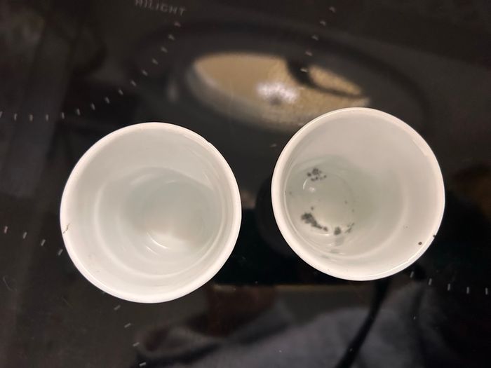 Très bon état général. Pas d'ébréchure. À noter qu'il reste un résidu d'étiquette sous l'un des gobelets (visible sur la photo 4), qui s'enlèvera facilement avec un peu d'eau chaude ou d'alcool.