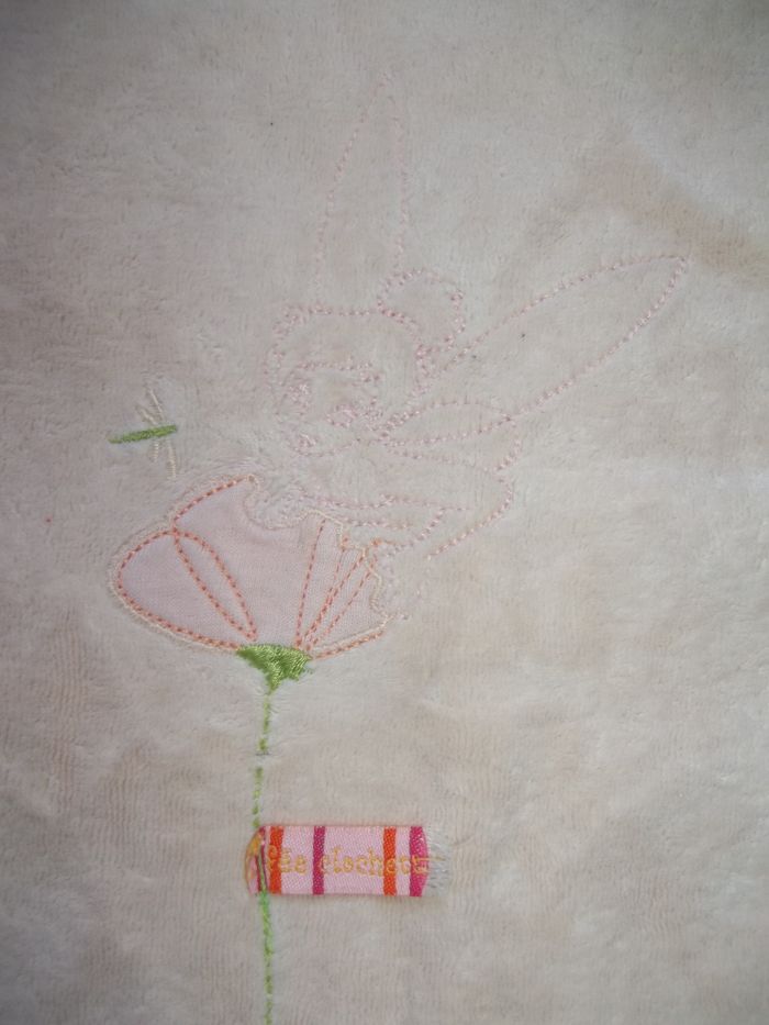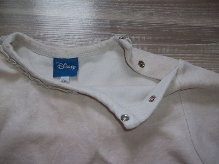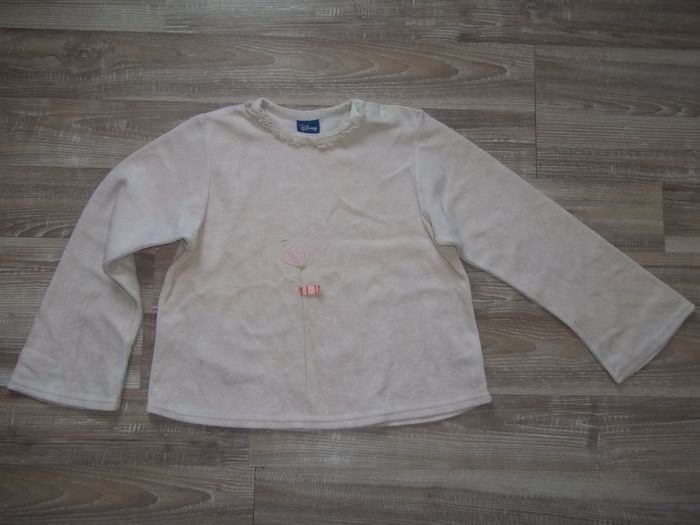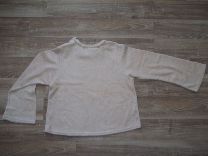 Haut de pyjama en velours ras rose clair pêche, 76 % coton 24 % polyester, manches pagode (s'élargissant), col rond, ouverture pressionnée sur épaule gauche. Broderie discrète Fée Clochette sur une fleur. Longueur 44 cm, manches 46 cm, largeur épaules 29 cm, aisselles 40 cm, poignets 14/15 cm.