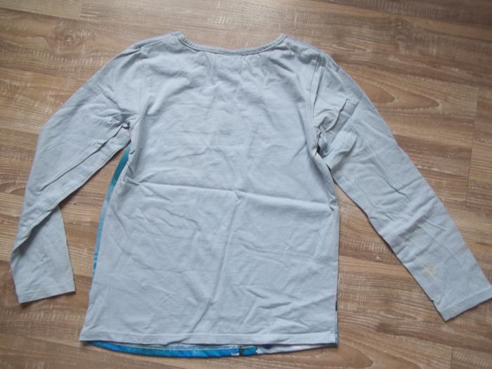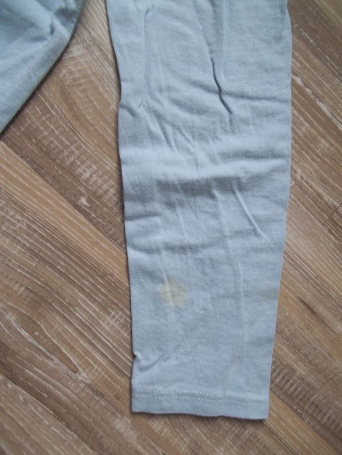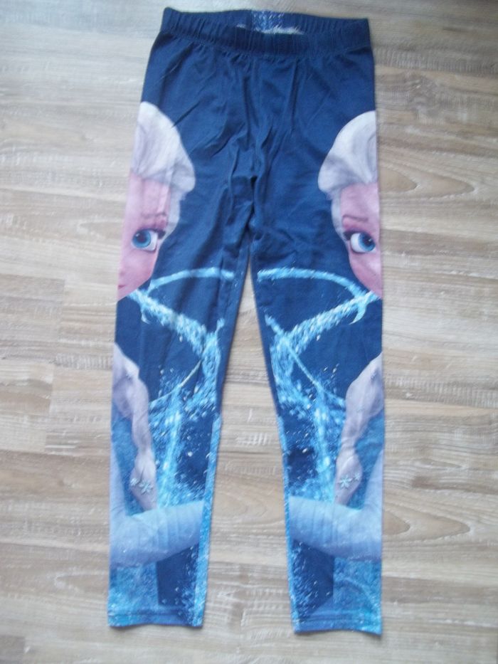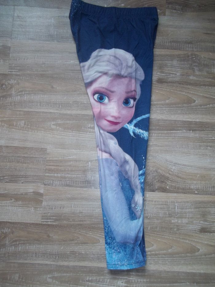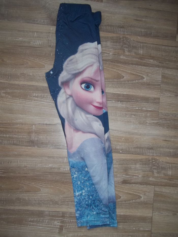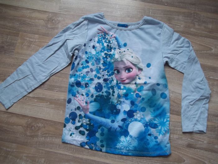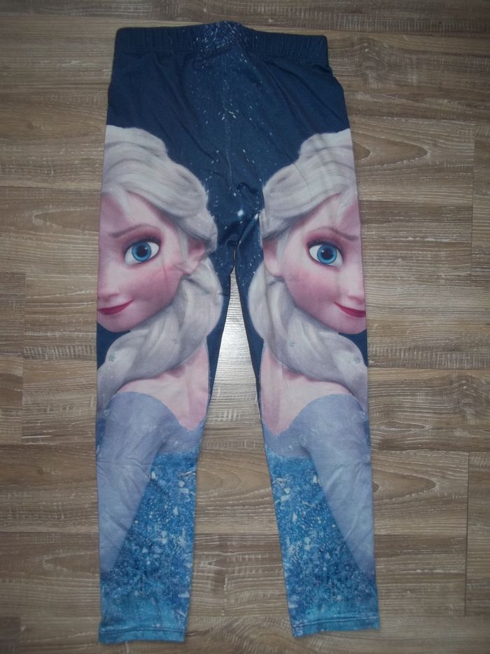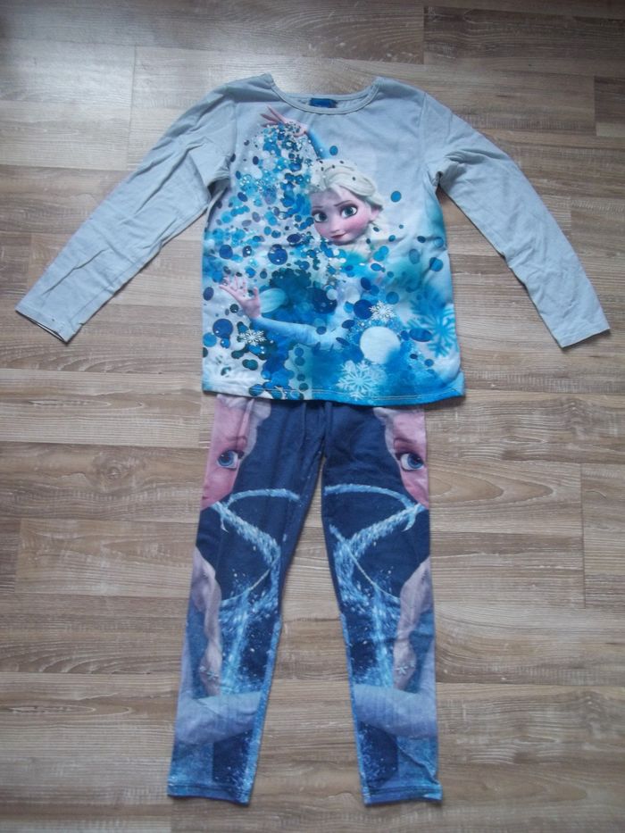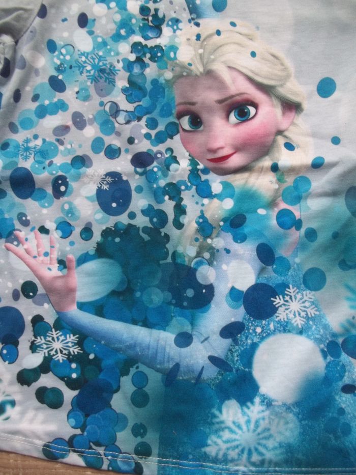 Pyjama long 2 pièces, mi-saison bleu clair dominant. Haut 100 % coton, col rond, tissu imprimé Elsa sur tout le devant, longueur 47 cm, manches 44 cm, largeur épaules 29 cm, aisselles 34 cm, poignets 8 cm. Restent quelques petites tâches. Bas forme caleçon (93 % coton 7 % élasthanne), taille élastiquée, bleu foncé dominant, impression symétrique Elsa sur chaque jambe, entrejambe 51 cm, largeur min taille 24 cm, bas jambes 10 cm.