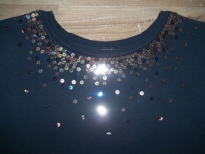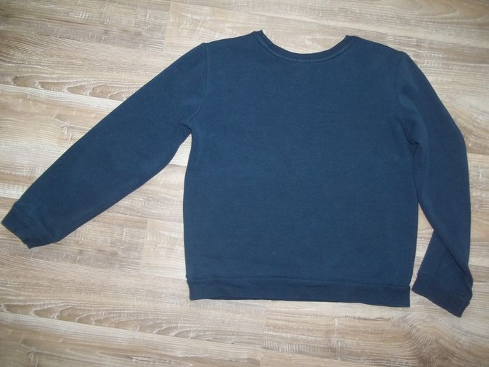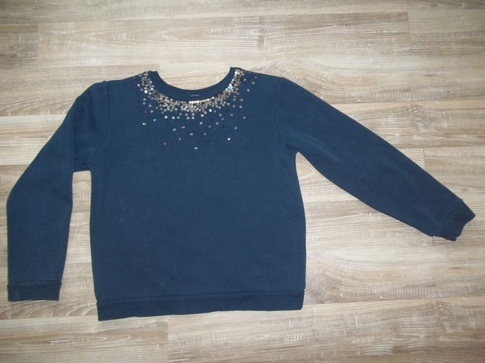 Sweat à col rond, en molleton bleu marine (à priori polycoton - plus d'étiquette de composition). Poignets et bas doublés. Sequins argent/cuivre/bleu marine cousus sur col. Longueur 47 cm, manches 46 cm, largeur épaules 35 cm, aisselles 42 cm, poignets 10 cm.