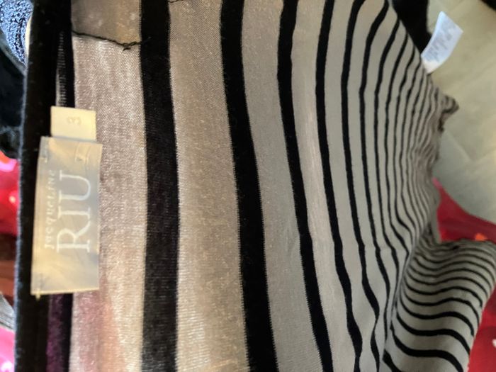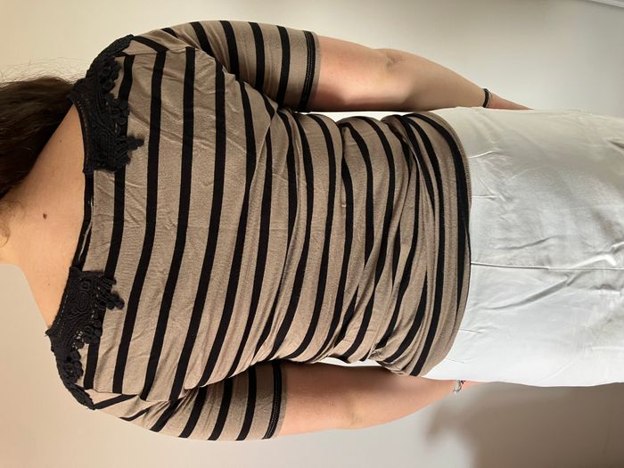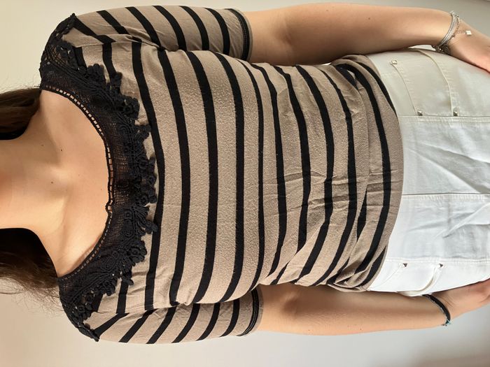 Haut rayé noir beige 3/4 manches et dentelles sur le col