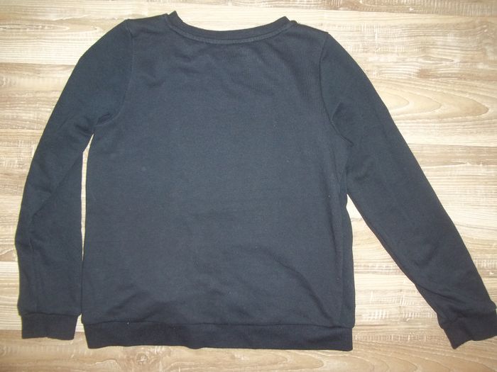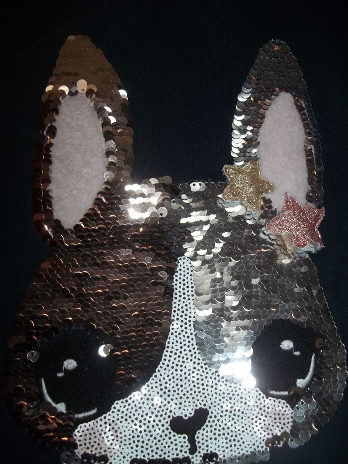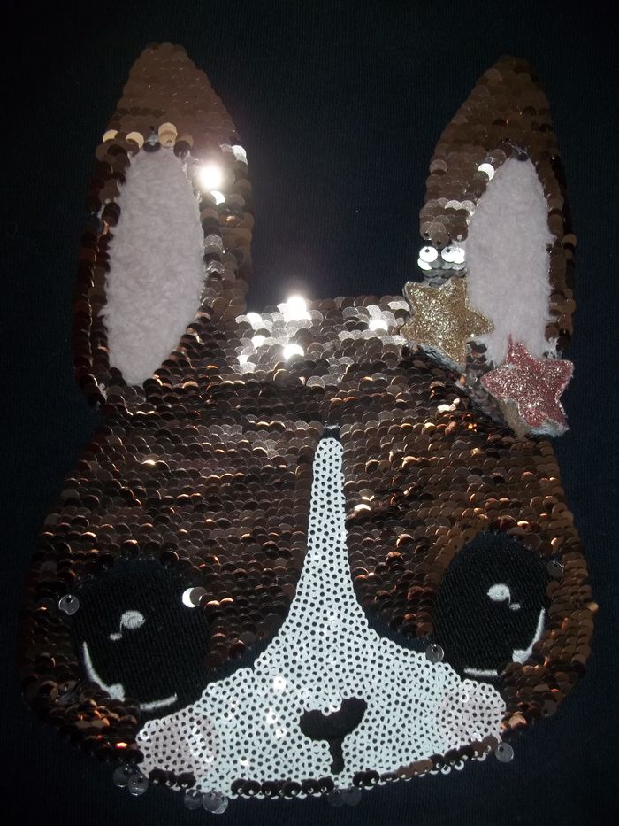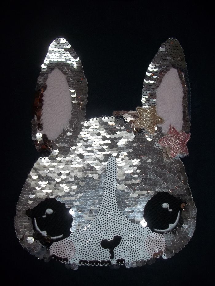 Sweat à col rond, en molleton bleu marine foncé (plus étiquette de composition mais à priori polycoton). Poignets et bas en côtes doublés. Tête de lapin en partie en sequins réversibles, velours, et patchwork, les étoiles se décousent en partie. Longueur 50 cm, manches 50 cm, largeur épaules 29 cm, aisselles 39 cm, poignets 7/8 cm.