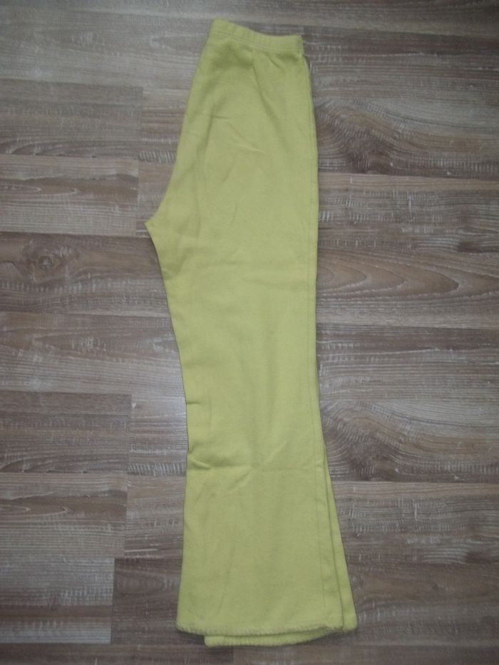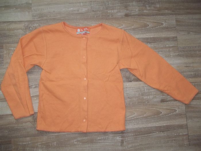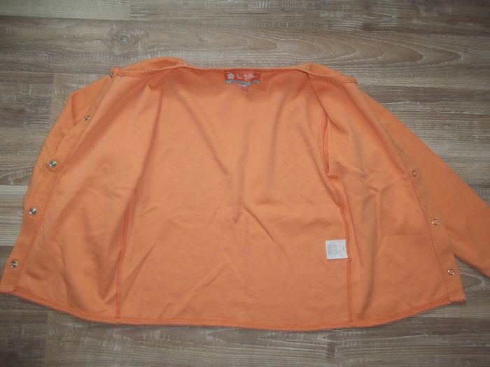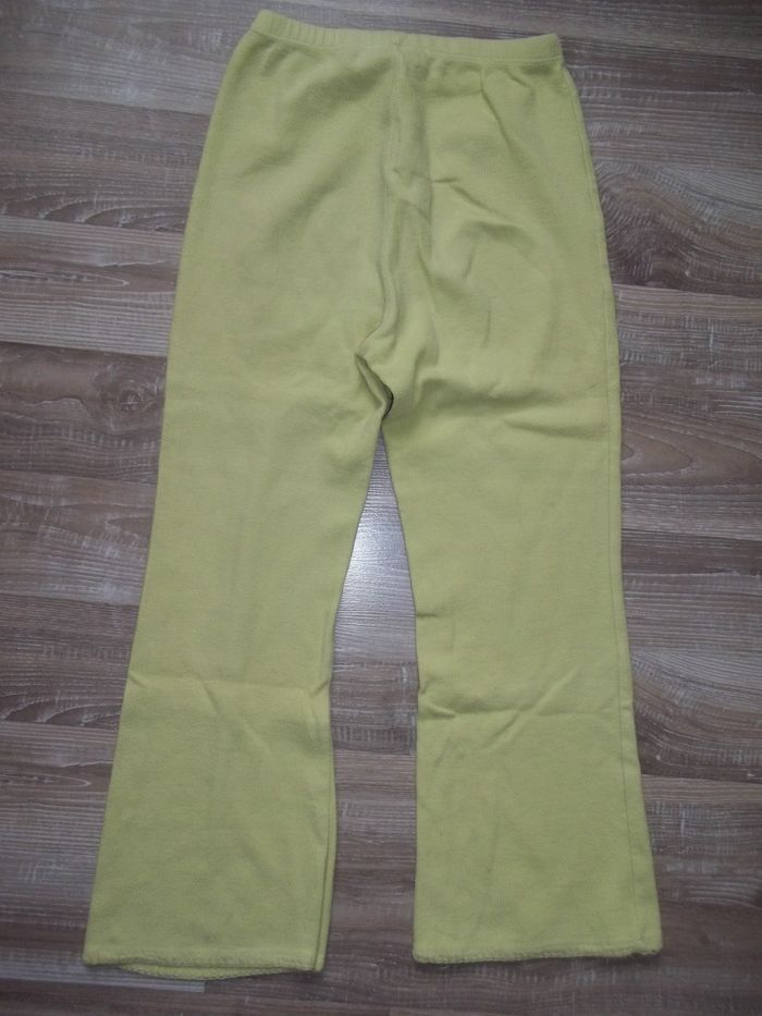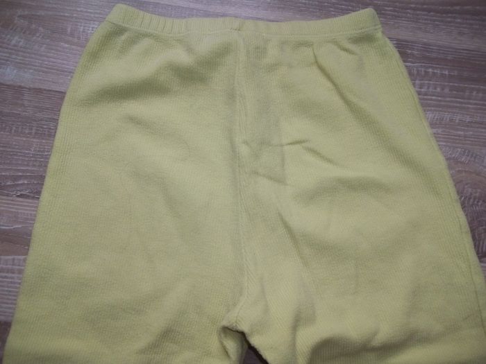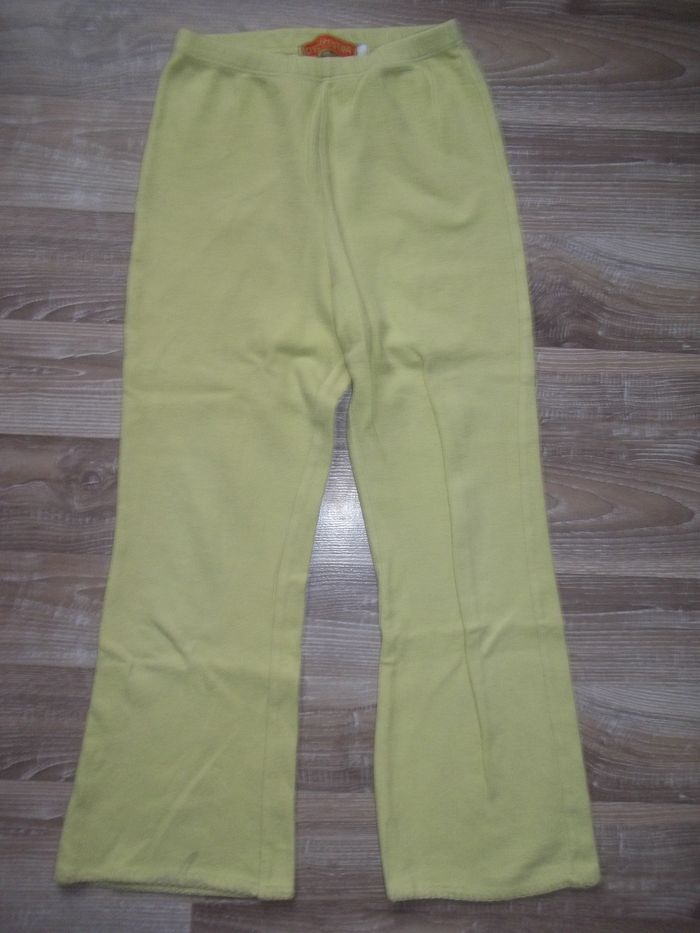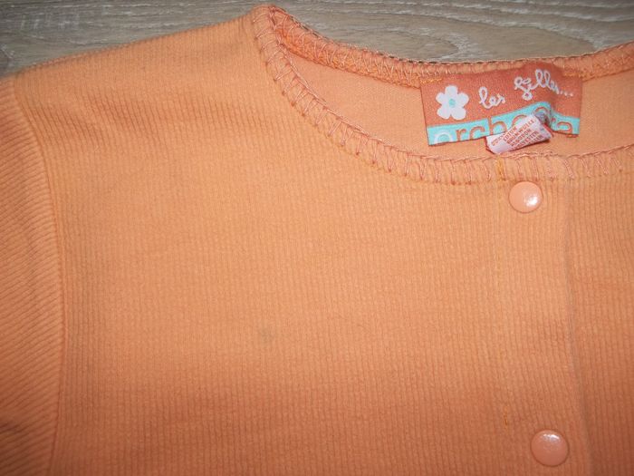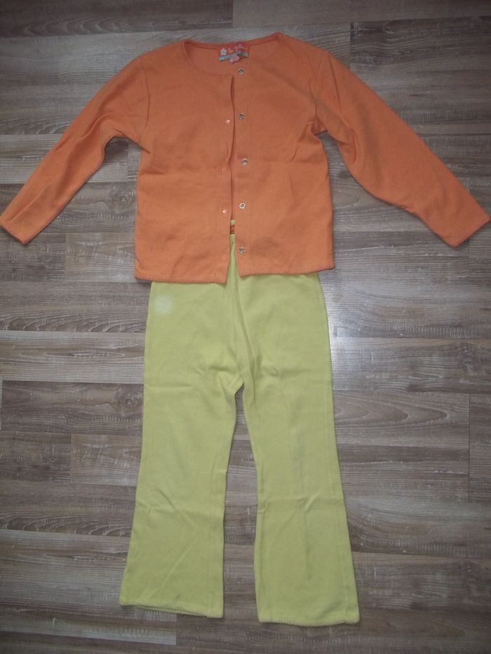 Pyjama long 2 pièces en tissu doux finement côtelé, 80 % coton 20 % polyester, bords festonnés ton sur ton. Haut orange clair forme cardigan, fermé par 5 pressions, longueur 46 cm, manches 43 cm, largeur aisselles 35 cm, poignets 9/10 cm. Bas jaune forme bootcut taille élastiquée, entrejambe 50 cm, largeur min taille 24 cm, bas jambes 20 cm. Un peu bouloché et restent quelques tâches.