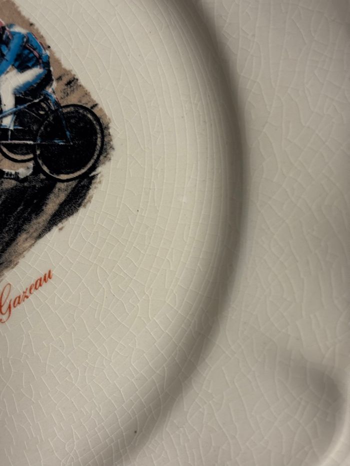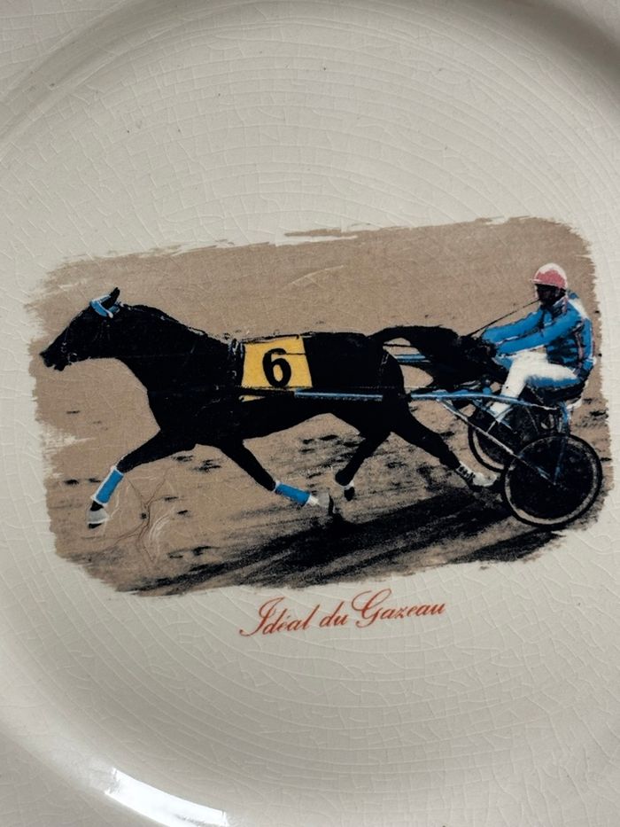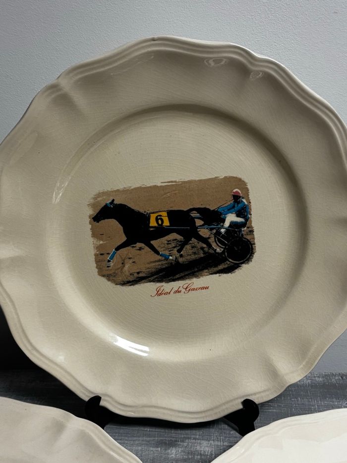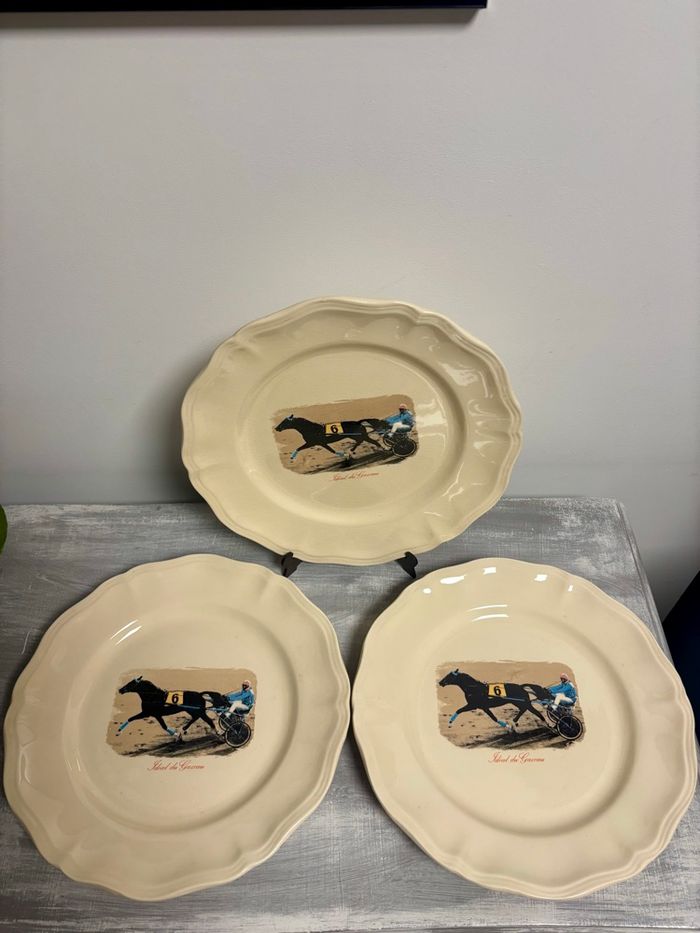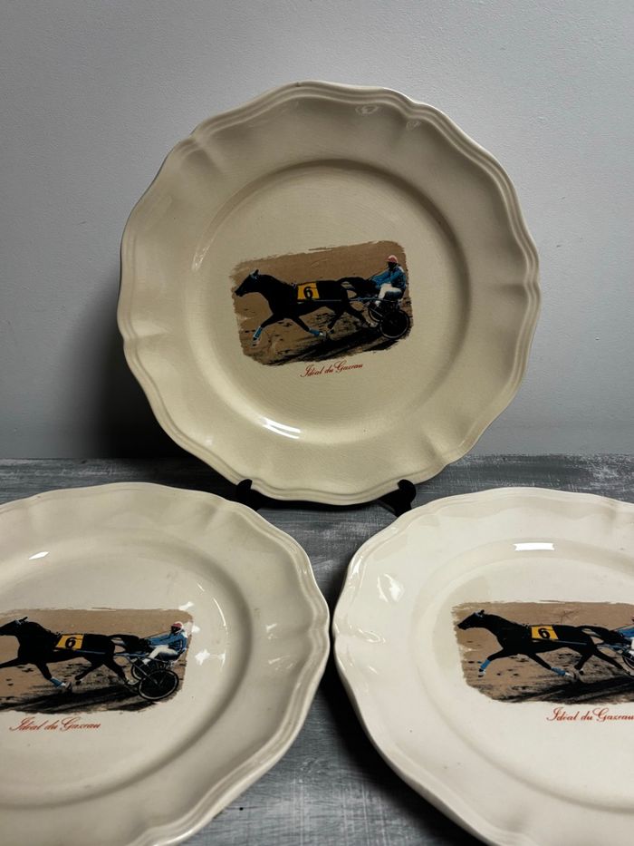 Ce lot comporte 3 assiettes plates à l’effigie du cheval Idéal du Gazeau. Elles n’ont jamais servi.