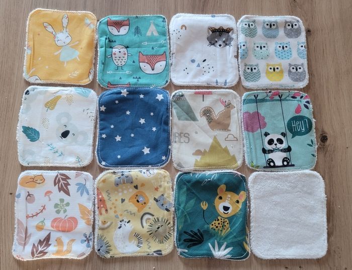 Voici un lot de 12 lingettes lavables Ces lingettes sont douces, idéales pour la toilette de bébé. Ou le soins du visage de maman. Un côté coton Oeko-Tex, sur le thème de l amour. Un côté éponge ecrue en Bambou trés douce pour les fesses de bébé ou le visage. Dimensions : environ 9cm sur 10cm. Lavable en machine jusqu'à 40 degrés, sèche linge doux. Pour plus de renseignements me contacter.