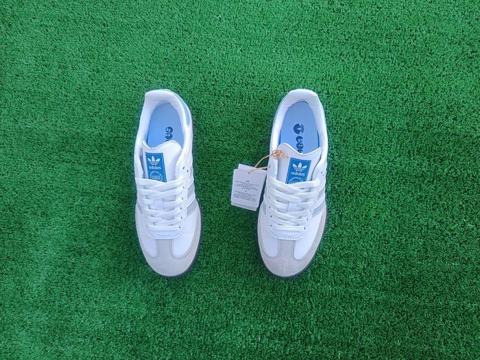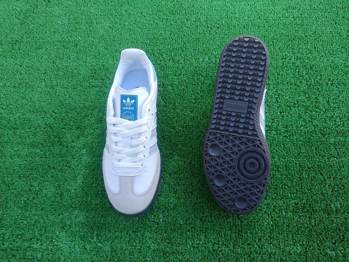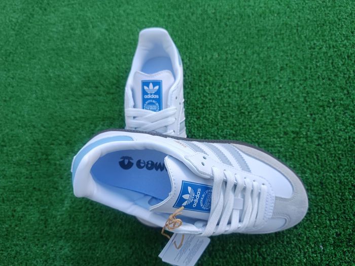 Baskets Adidas Samba blanches avec empiècements en suède gris clair et trois bandes gris pâle, détails bleu clair au talon. Modèle iconique et intemporel Adidas, idéal pour un style streetwear, casual ou vintage. Tige en cuir lisse de qualité avec renfort en suède à l’avant, semelle en gomme grise offrant une excellente adhérence et un grand confort au quotidien. Sneakers Adidas Samba très recherchées, faciles à assortir avec jeans, pantalons ou tenues décontractées, parfaites pour un usage quotidien et un look tendance.