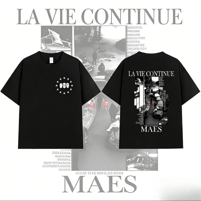 T-shirt noir avec visuel “La vie continue”, design fort et esthétique street.