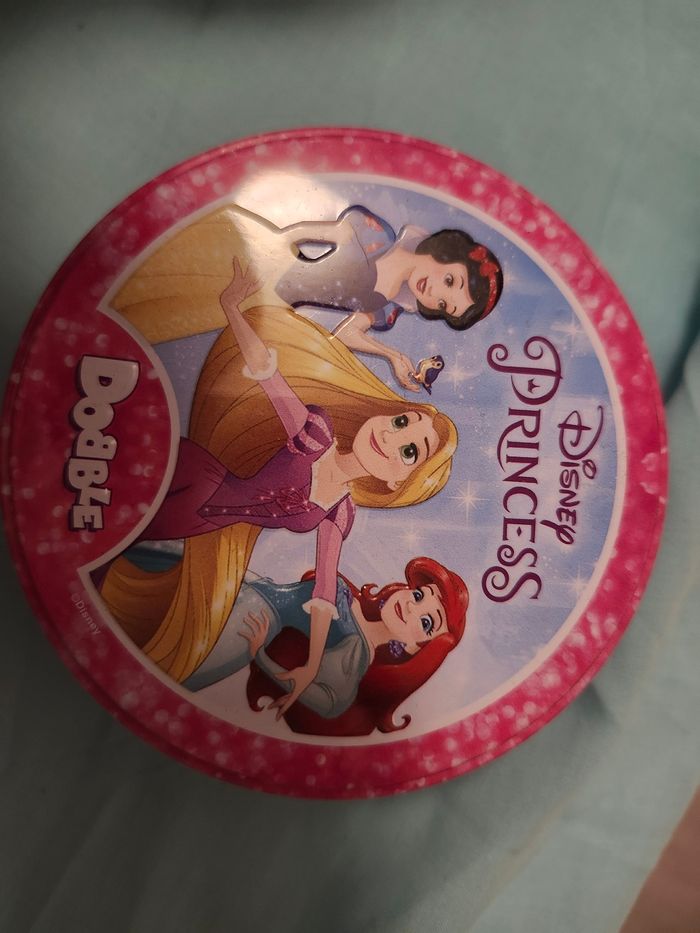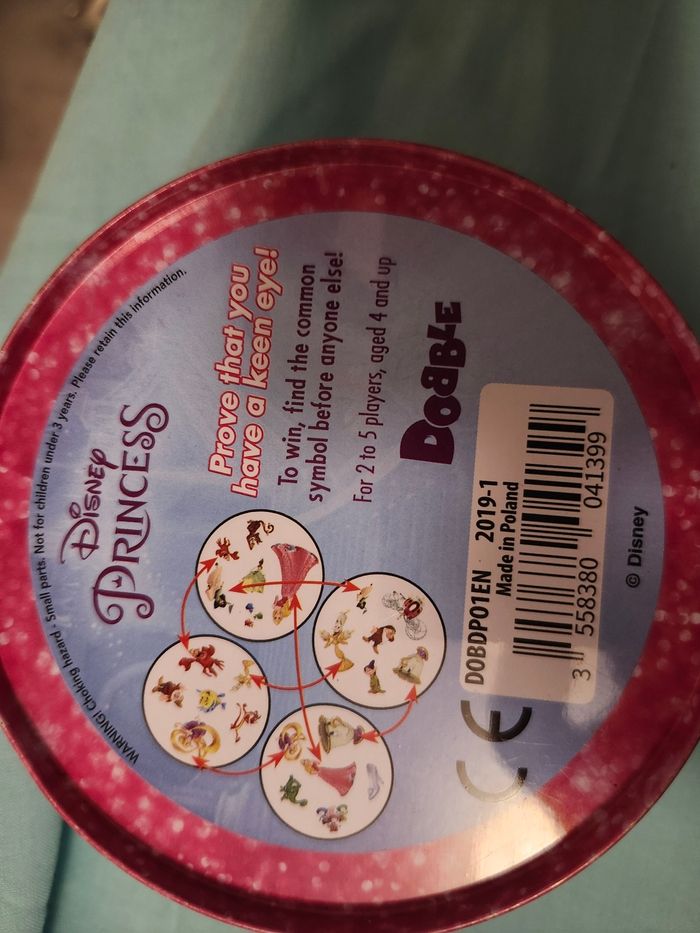 N’hesiter pas a faire des lots. Dobble Disney Princess se compose de 30 cartes, représentant 6 images de la franchise Disney Princess. Trouvez l’image en commun entre les cartes plus rapidement que vos amis. Il inclut 5 mini-jeux supplémentaires pour garder le jeu intéressant. 3 ont été inspirés par Dobble, 2 sont spécialement conçus pour cette version pour les enfants. Il y a également moins de symboles, pour simplifier et raccourcir le jeu. Il est parfait pour les fêtes et rassemble des personnes de différents âges. Dobble Disney Princess - Le jeu qui voit double. Dobble Disney Princess est un jeu de rapidité, d'observation et de réflexes. Faites la course pour trouver l’image en commun de 2 cartes. Les images peuvent être de différentes tailles et mises sur n'importe quelle partie de la carte. Elles peuvent être difficiles à identifier Chaque carte est unique et a seulement une image en commun avec les autres cartes du jeu. Contient 5 mini jeux faciles et rapides pour les enfants de 4 ans et plus.