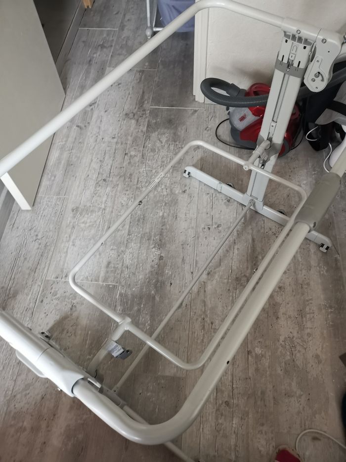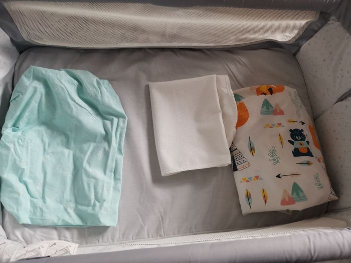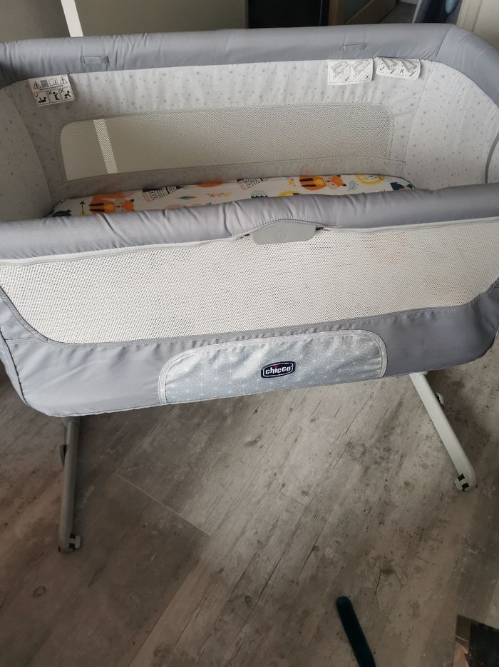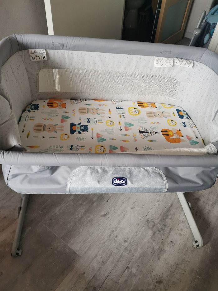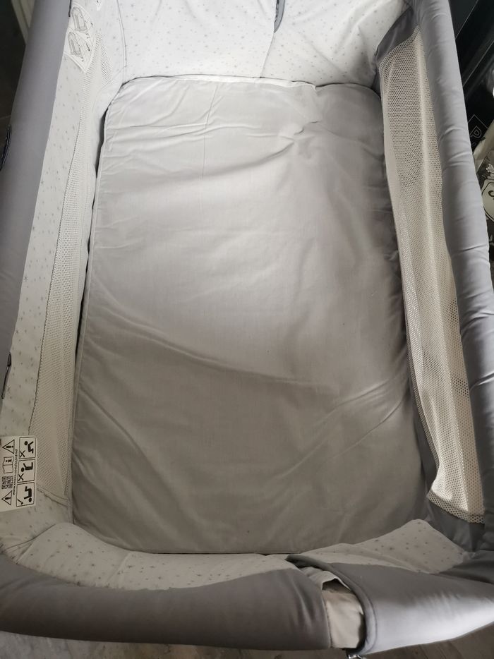 Comme neuf vendu dans sa housse de transport une poignée à tourner pour prendre bébé ou coller à la hauteur du lit avec les sangles. Plusieurs hauteurs, possibilité d'inclinaison et de tourner les pieds côté lit. Une alèse imperméable + 2 draps housses