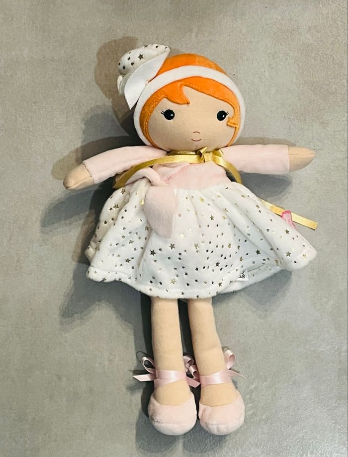 Découvrez la danseuse classique qui fera rêver toutes les petites fan de ballet ! Habillée d'un cache-coeur rose poudré réhaussé d'un foulard doré et d'une jupe toute douce à imprimé d'étoiles champagne, Valentine révèle un style délicat et raffiné. Sa chevelure rousse la différencie des autres poupées en tissu Tendresse de Kaloo. Lavable en machine.