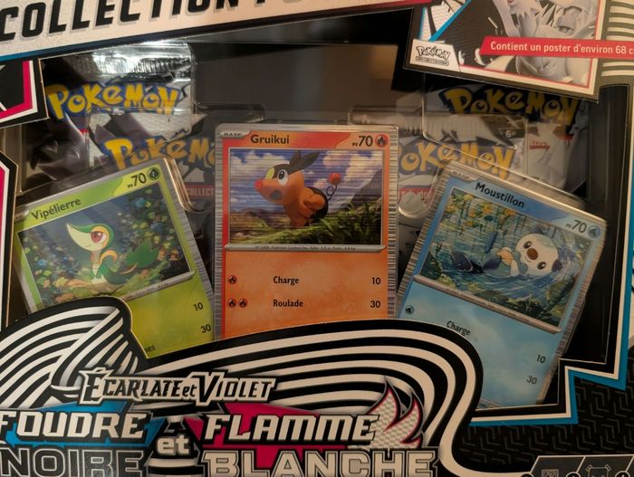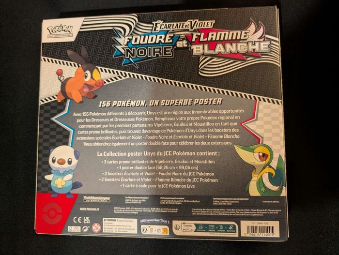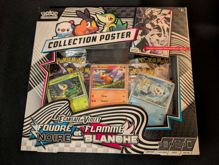 Je vends cette collection poster Pokémon "Foudre Noire et Flamme Blanche", un superbe produit de collection scellé et en parfait état. - Type de produit : Collection de posters Pokémon - Série : Foudre Noire et Flamme Blanche - Contenu : 3 cartes promo brillantes, 1 poster double face, 2 boosters Foudre Noire et 2 boosters Flamme Blanche, 1 carte à code pour le JCC Pokémon Live État neuf, scellé. N'hésitez pas à me contacter pour plus d'informations ou de photos.