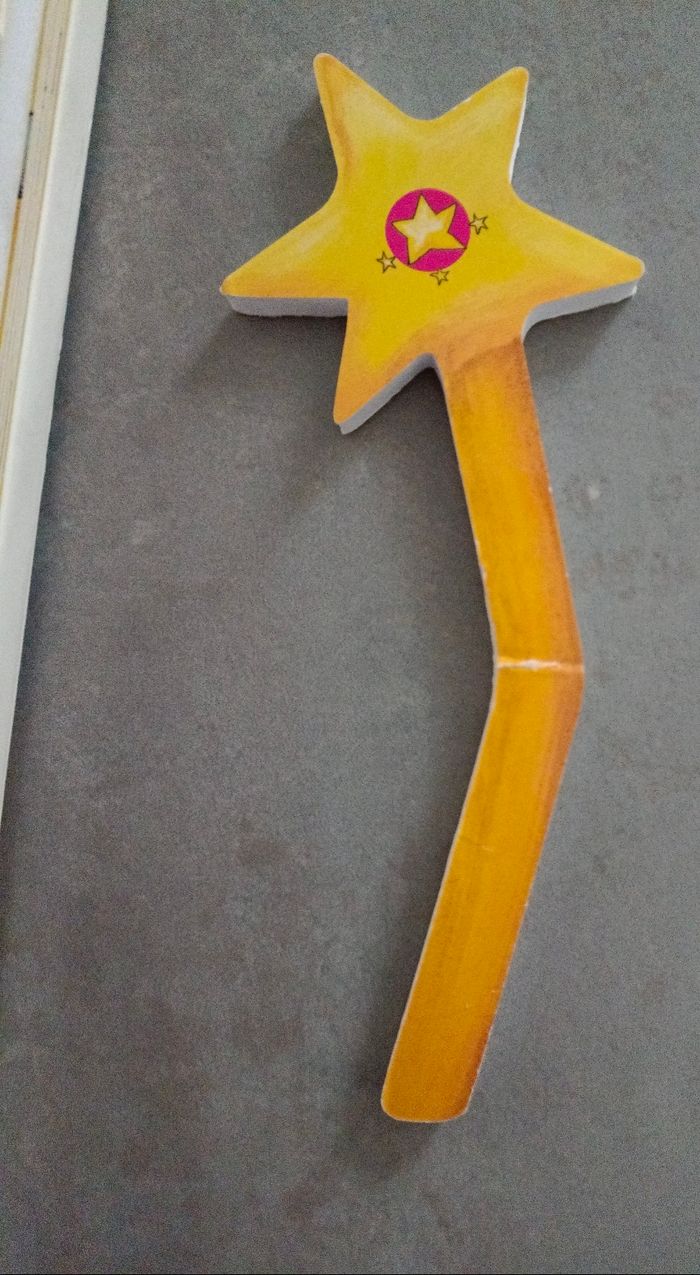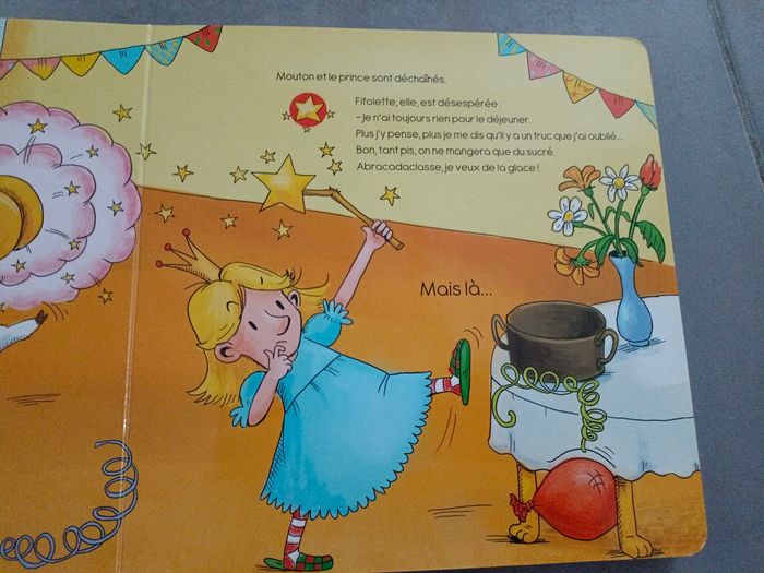 Avec sa baguette magique cassée, elle veut préparer un déjeuner. Mais comme sa baguette n'en fait qu'à sa tête, ce sont des instruments de musique qui apparaissent.