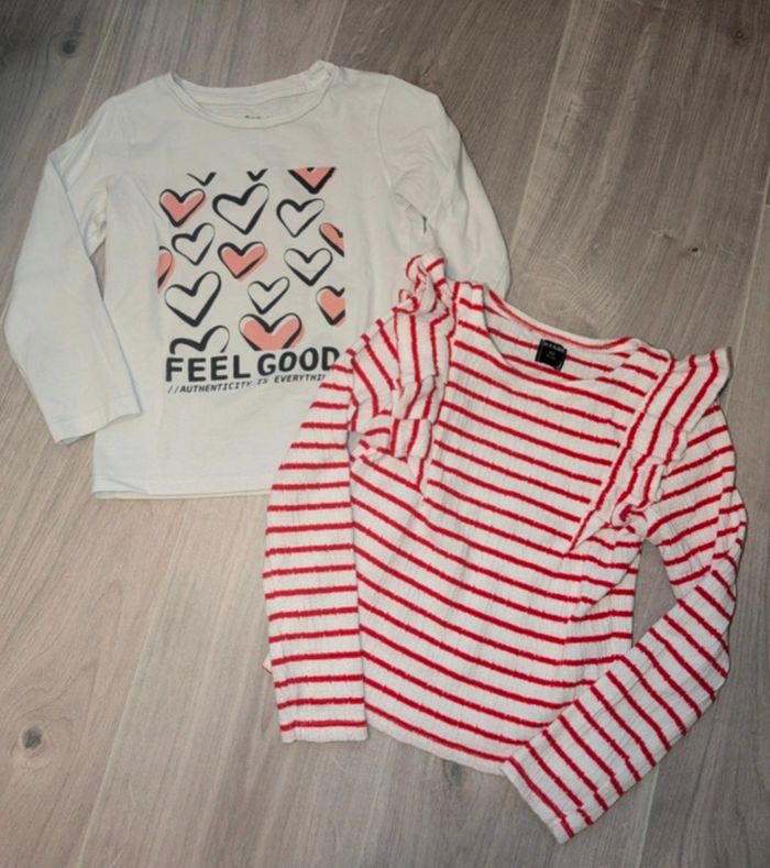 Lot de : • 1 pull style marinière • 1 Tshirt manches longues motif coeur Tout est en très bon état. Marque : Gémo et Kiabi