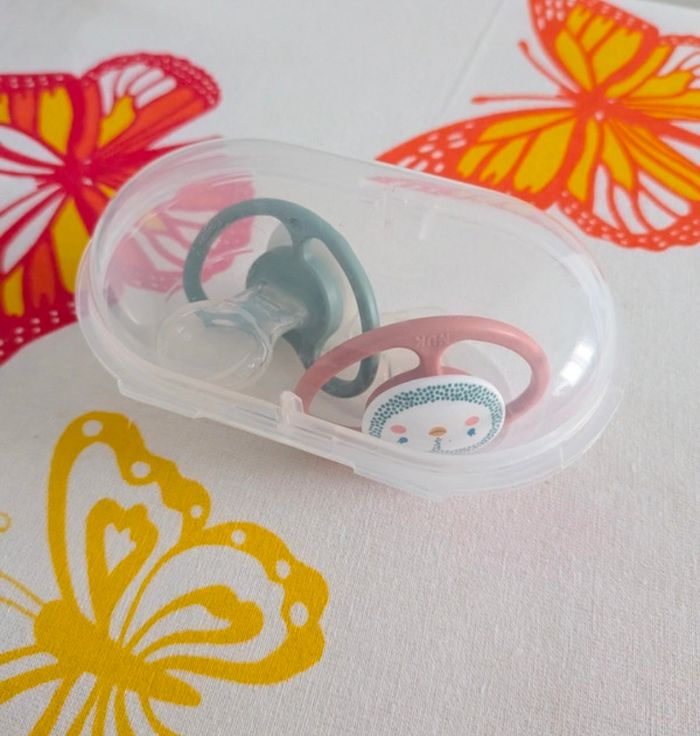 Lot de deux sucettes neuves (jamais utilisé, ma fille préfère les sucettes d'une autre marque). Une tétine est phosphorescente.