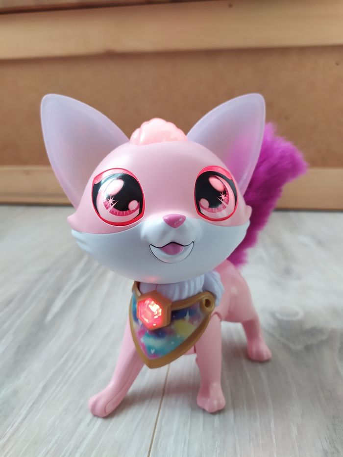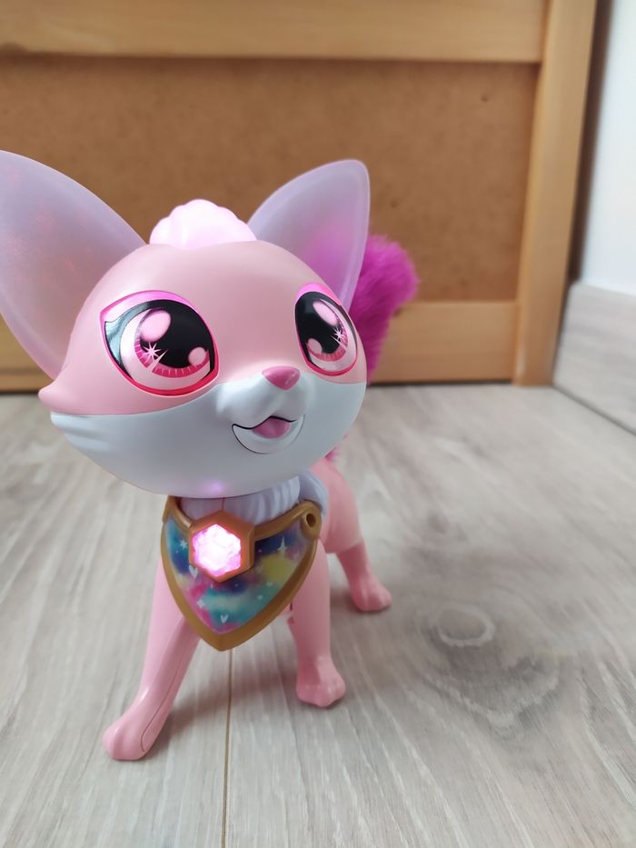 Le jeu est magique avec Sparklings Foxy le renard! Ce magnifique jouet en forme de renard parle, chante et s'illumine avec un kaléidoscope de couleurs. Touchez le collier magique de Foxy, puis touchez ses cheveux, ses yeux et ses oreilles pour changer leur couleur. Foxy répondra avec plus de 100 réponses amusantes et magiques sur son humeur, ses sentiments et ses couleurs porte-bonheur. Chantez un duo coloré avec Foxy en touchant sa bouche. Poussez la jambe de Foxy pour qu'elle remue la queue et déclenche des lumières et des réponses ludiques. Destiné aux enfants de 4 ans et plus. Nécessite 2 piles AAA fournies.