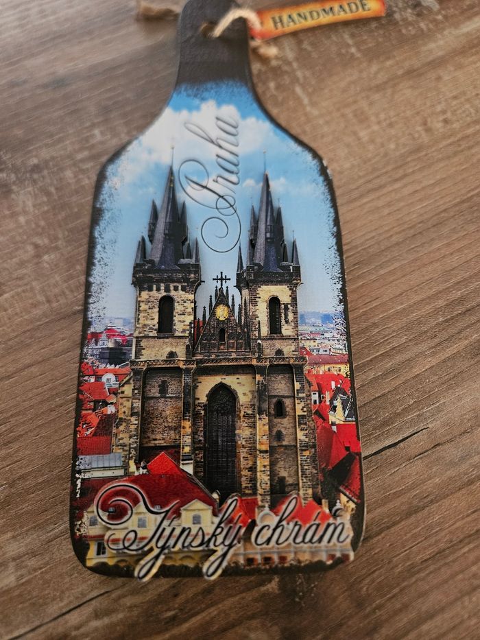 On peut le voir grâce aux inscriptions « Praha » (nom tchèque de Prague) et « Týnský chrám », qui désigne l’église Notre-Dame du Týn, un monument emblématique situé sur la place de la Vieille-Ville.
