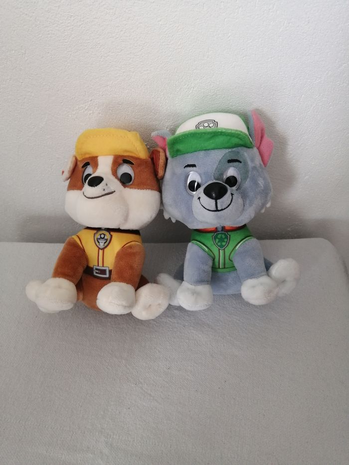 lot de 2 peluche chien ruben et rocky paw patrol pat patrouille avec yeux suiveurs 18cm étiquette coupée