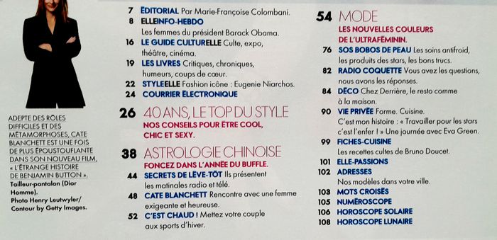 spécial bertrand burgalat 2 pages, 40 ans top du style 7 pages, matinales radio télé présentateurs 4 pages, cate 4 pages, mode premier printemps, bobs de peau 6 pages, déco resto comme à la maison 6 pages, eva green 1 page..