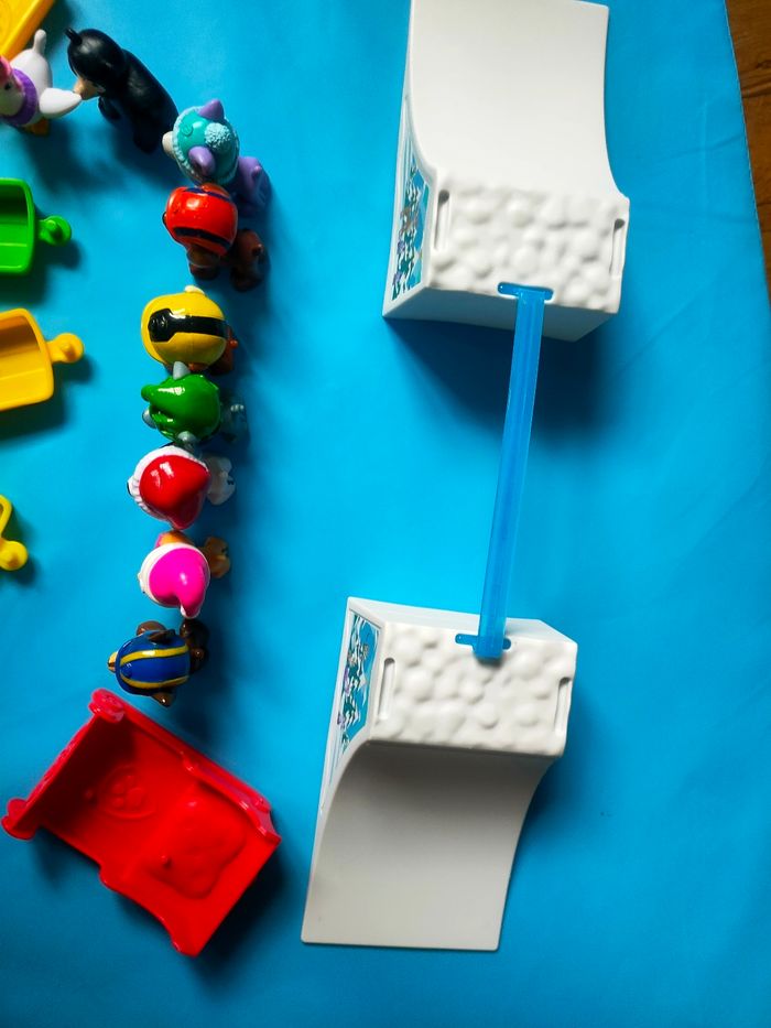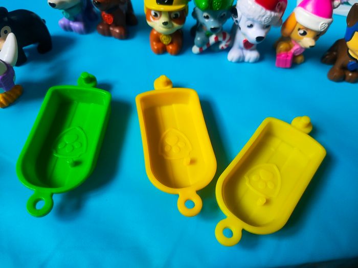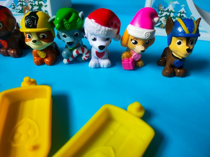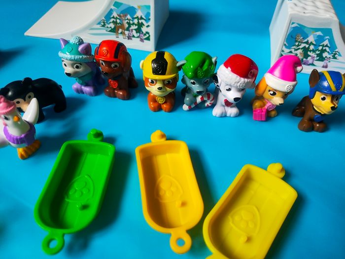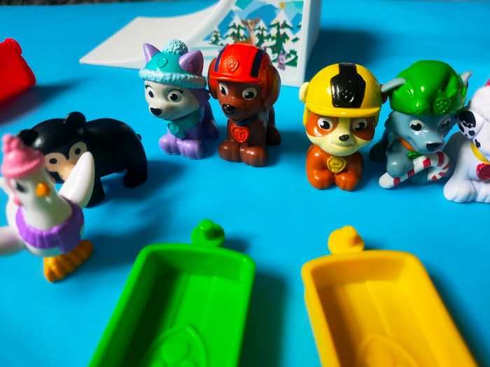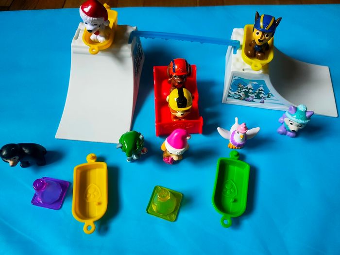 Lot 7 figurines pat patrouille +1 gallinetta+1 ours Environ 5 cm +1 traineau + 4 luges +2 plots +Piste luge Bon état