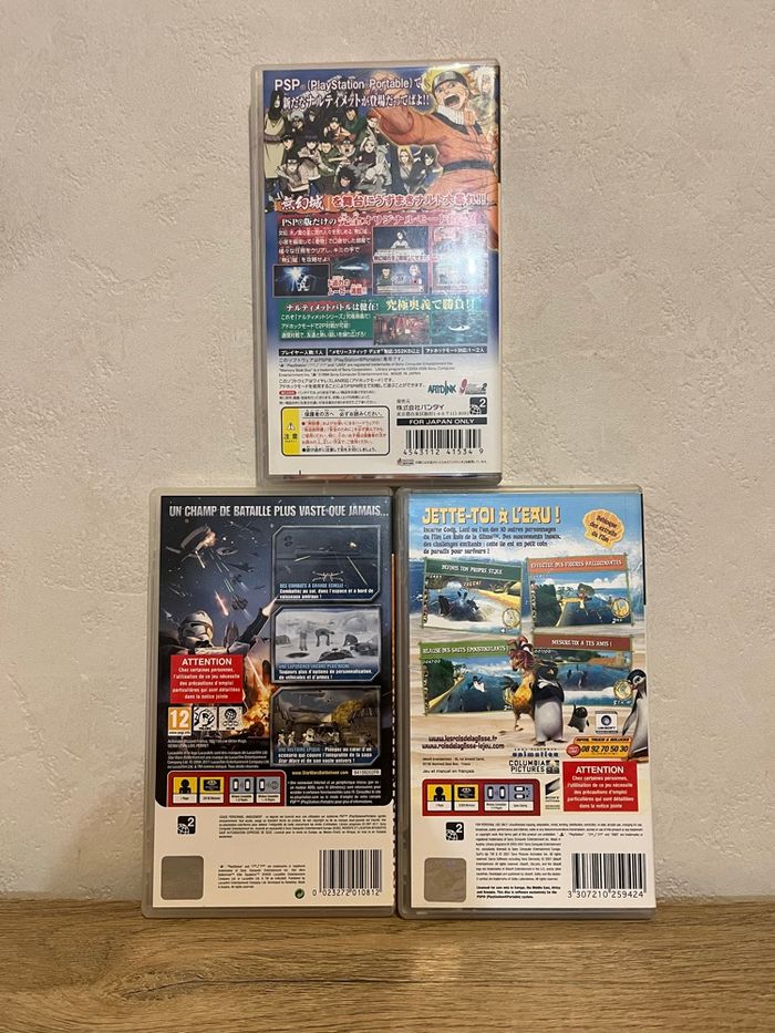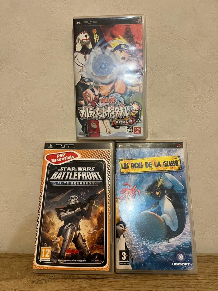 Je Jeu Psp Star wars battlefront, le jeu est fonctionnel et en français (Voir les photos). La notice est manquante et le boîtier de l’umd est rayé mais ne gêne pas l’utilisation du jeu. Jeu les rois de la glisse sur psp. Le jeu a sa notice, en français et fonctionne parfaitement ( voir les photos). Le boîtier de l’umd est rayé mais n’empêche l’utilisation du jeu. Naruto: Ultimate Ninja Heroes (titre japonais : Naruto: Narutimate Portable - Mugenjou no Maki) pour PlayStation Portable (PSP) Boîte et notice d’origine, en bon état général (voir photos). Jouable sur les PSP français, car les jeux ne sont pas zonés. Prix négociable ✅