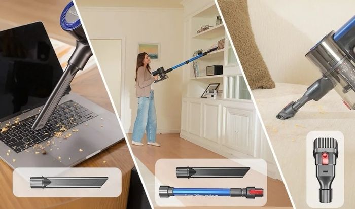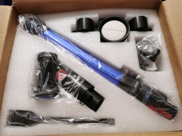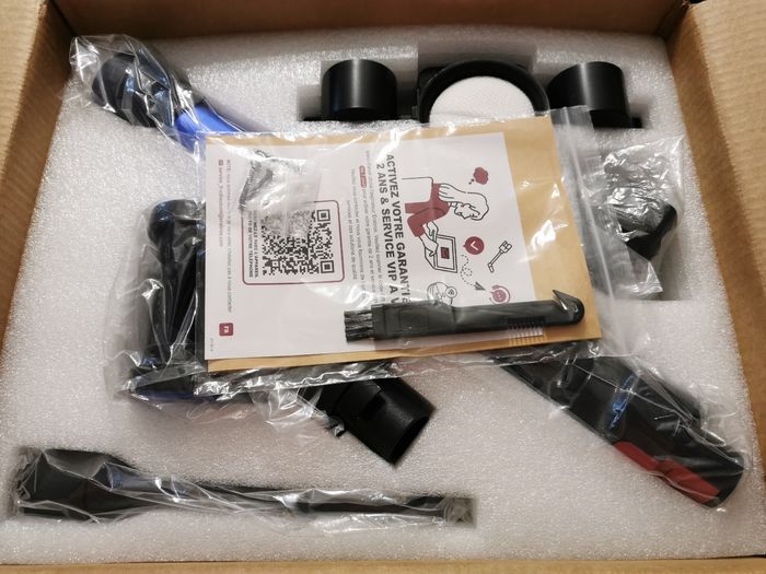 - Contenu de la Boîte : Tube d’extension*1, Filtre HEPA*1, Ensemble filtre à poussière, Aspirateur balai sans Fil Corps Principal EV2*1, Batterio*1, Brosse de Sol*1, Fixation Murale*1, Outil de Nettoyage*1, Adapteur Électrique*1, Manuel d’utilisation*1, Brosse polyvalente*1, Brosse suceur*1, Filtre HEPA*1.