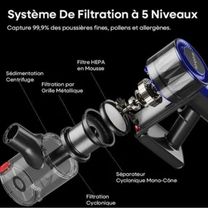 - Système de filtration + cyclonique à 5 niveaux, capture 99,9 % des particules microscopiques (jusqu’à 0,3 micron).