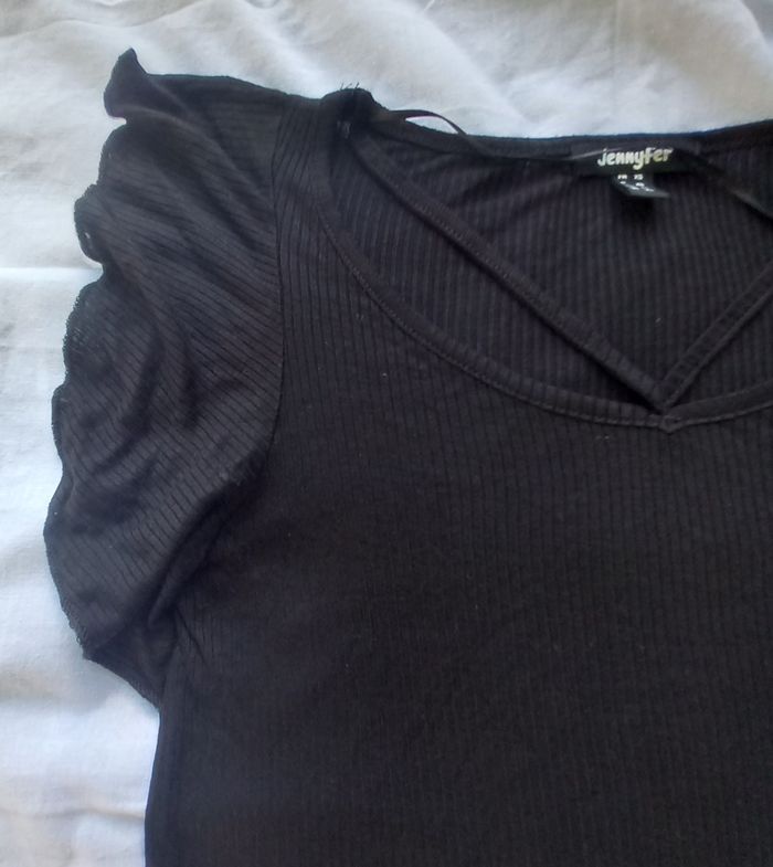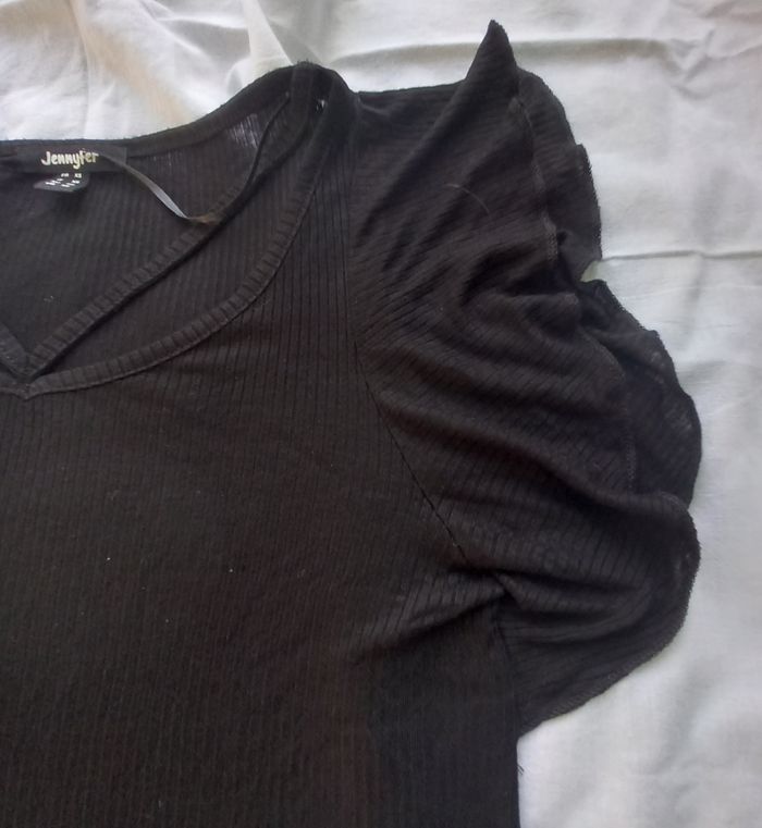 - Top manches courtes Jennyfer, manches courtes volants, col en V, coloris noir, matière principale 100% viscose, Largeur épaules 34 cm- aisselles 43 cm, Longueur épaule-bas 48 cm et aisselles-bas 30 cm