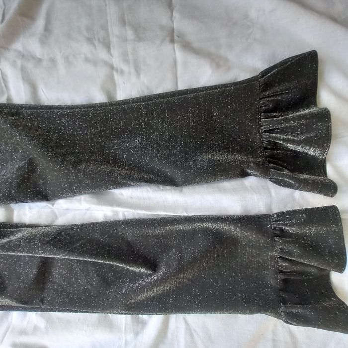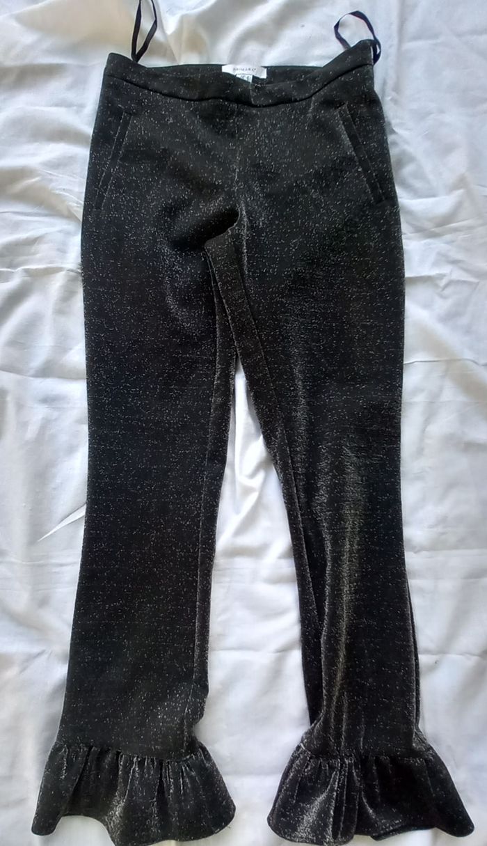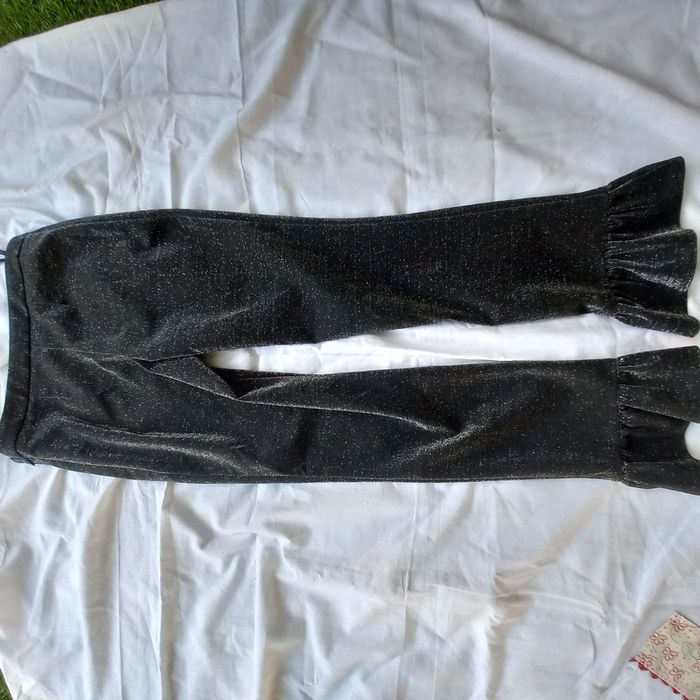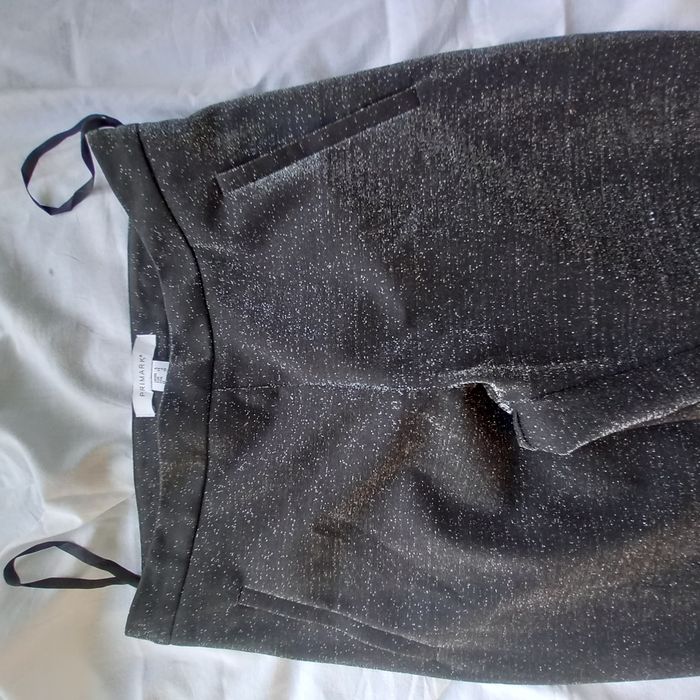 - Pantacourt Primark tissu gris pailleté, zop latéral, bas avec volants, Composition 86% polyester 9% fil métallisé, 5% élasthanne, Longueur taille -Bas 89 cm et entrejambe-bas 65 cm