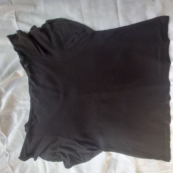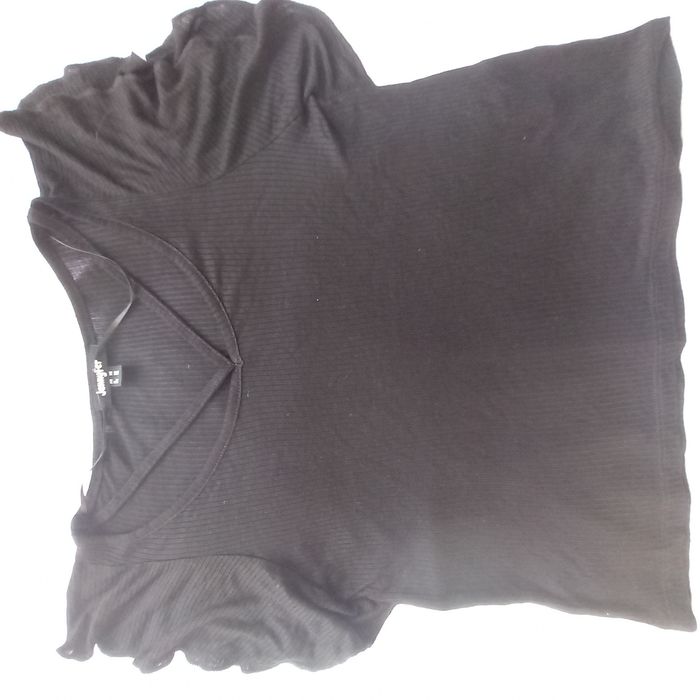 - Tee-shirt H&M manches courtes, coloris noir, bordures blanches, 65% polyester 35% viscose, Largeur épaules 35 cm- aisselles 40 cm, Longueur épaule-bas 44 cm et aisselles-bas 26 cm