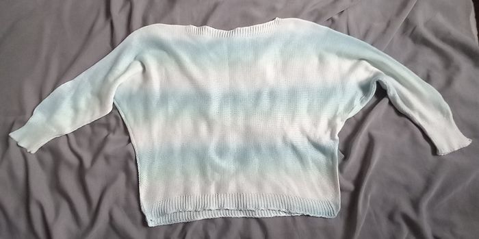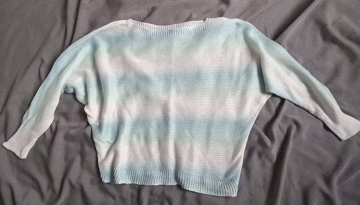 - Pull made in Italy manches longues resserrées au bout, col ouverture carrée, composition 95% viscose 5% élasthanne, coloris blanc et bleu ciel, manches chauve-souris, largeur épaules 56cm - aisselles 56 cm longueur épaule-bas = 50 cm et aisselle-bas = 34 cm longueur manches 46 cm