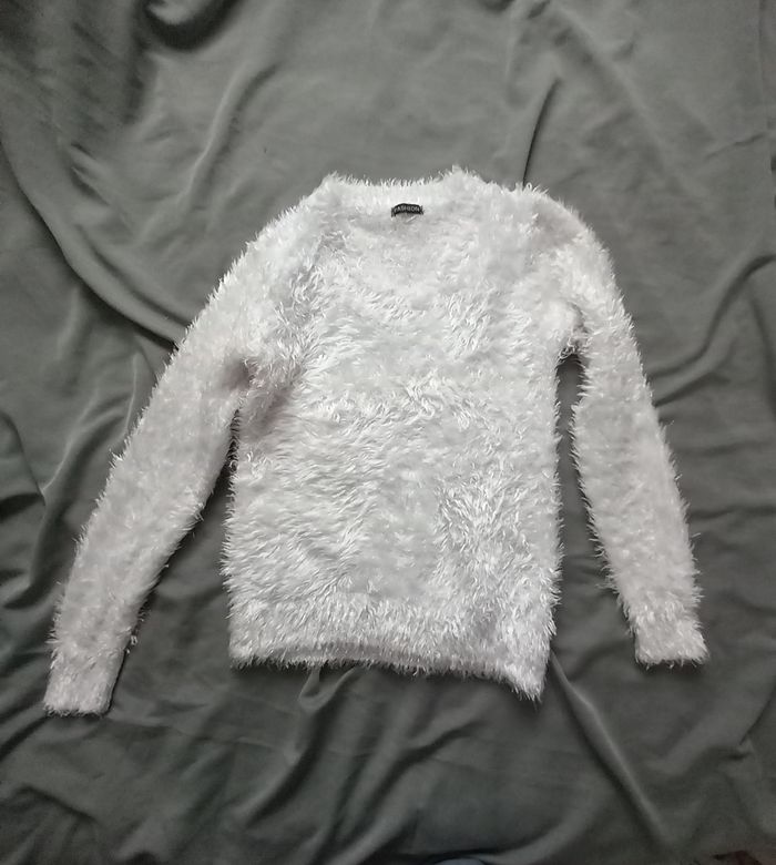 - Pull Fashion manches longues, col en V, toucher doux et agréable, coloris blanc, 100% polyester, largeur épaules 40 cm - aisselles 48 cm, longueur épaule-bas = 62 cm et aisselle-bas = 42 cm