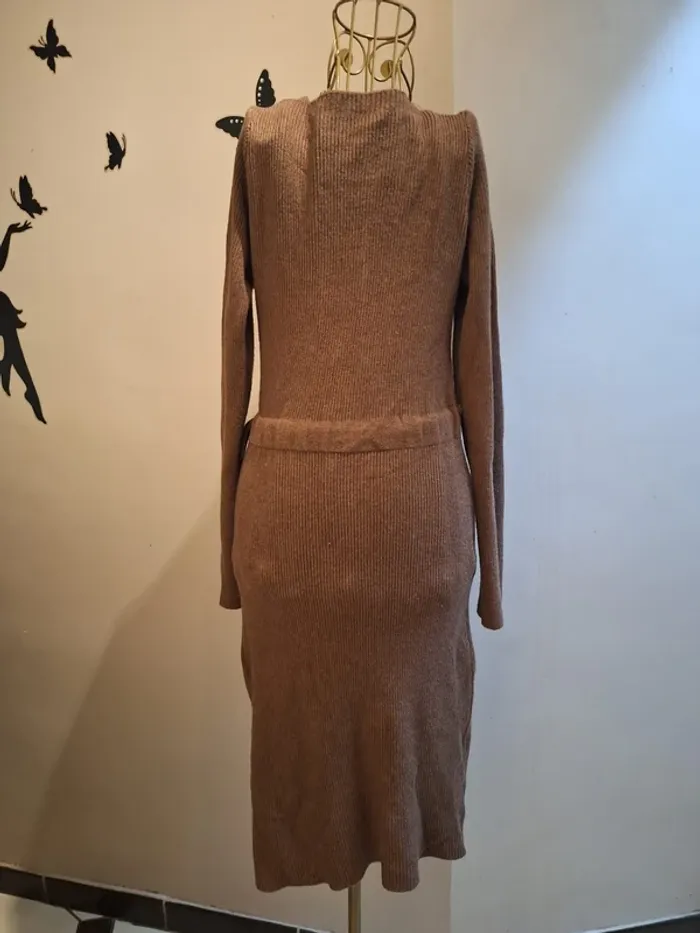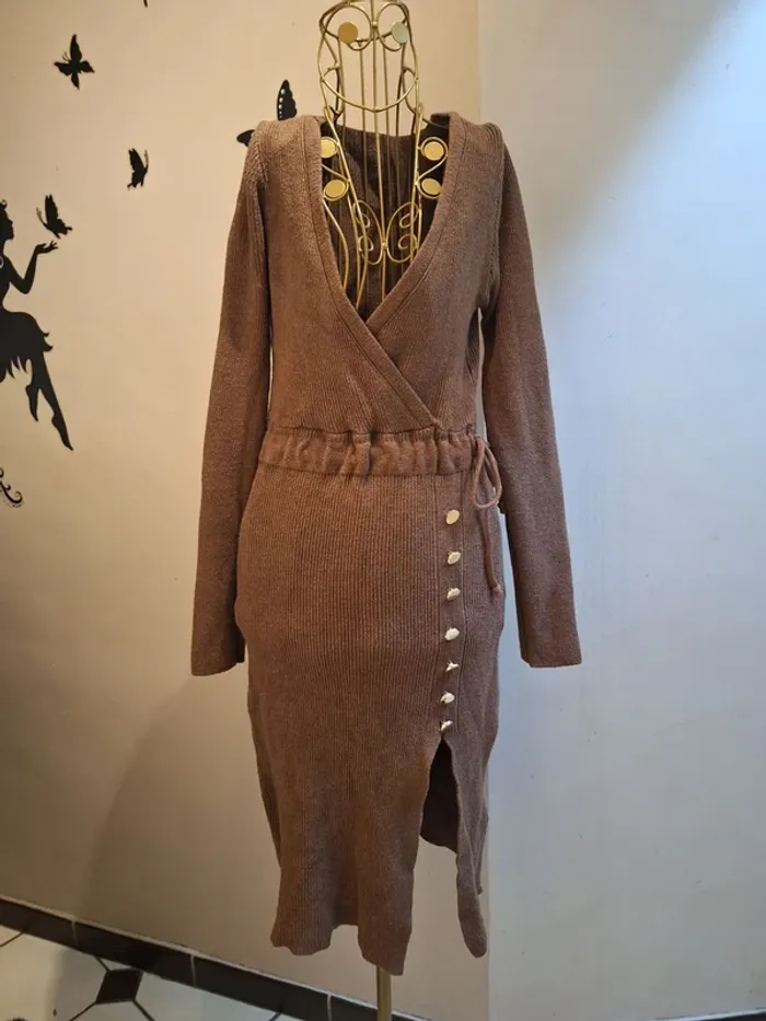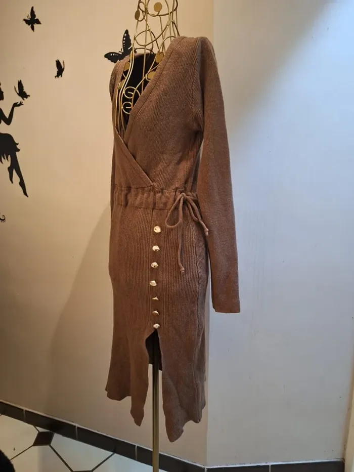 Robe pull marron en mailles cotelées - décolleté croisé en V - liens coulissant permettant de cintrer en fonction de votre morphologie - boutons décoratif et fendue sur un coté - matière douce; chaude & extensible - taille unique idéale pour les tailles S & M soit 36 & 38 - fabrication italienne - état sans défaut ps : je ne fais pas de photo portée #robepull #robepullmarron