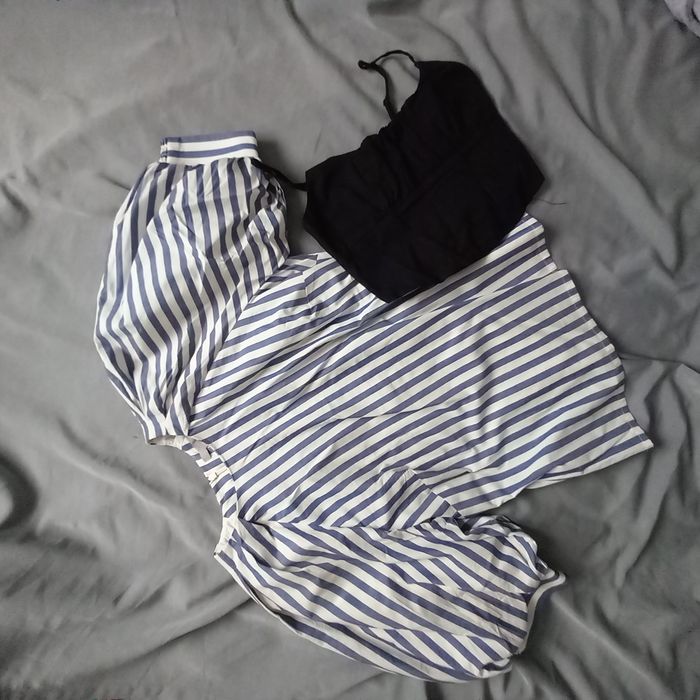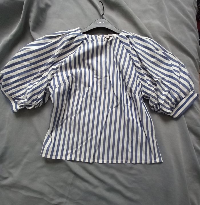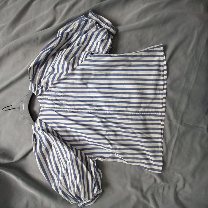 - Tunique H&M manches 3/4, Tissu imprimé à rayures coloris blanc et bleu, Zip au dos, manches ballon, 100% coton, largeur épaules 30 cm , aisselles 54 cm longueur épaules-bas 54 cm et aisselles-bas 33 cm,