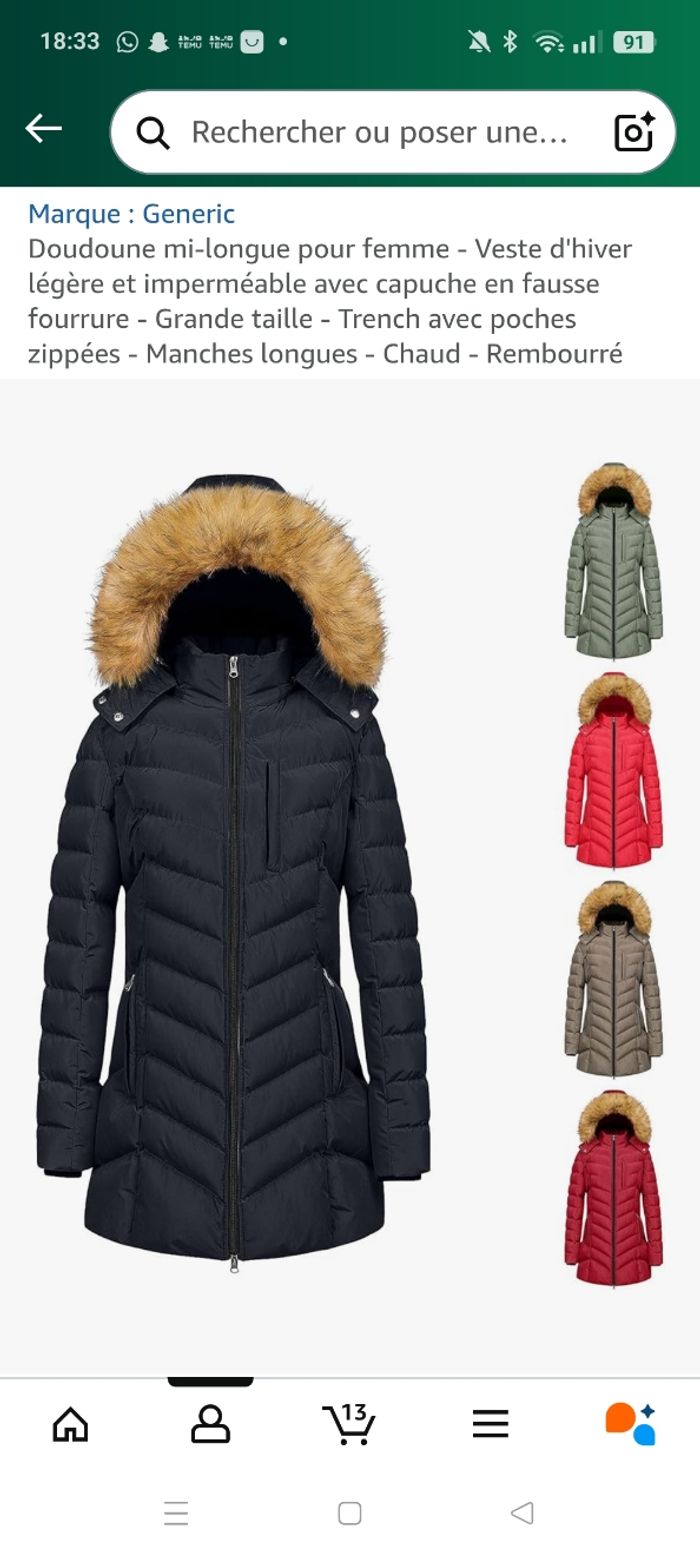 Doudoune épaisse, mi longue, noire, neuve avec etiquette, achetée sur Amazon mais taille trop petite (taille XL mais correspond plutôt a un S-M).