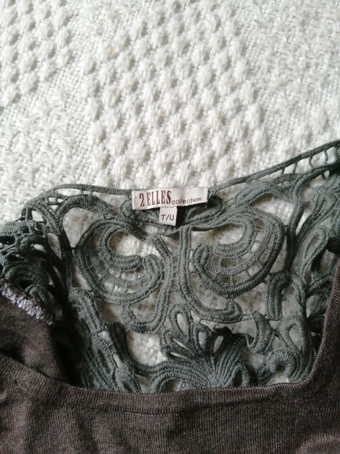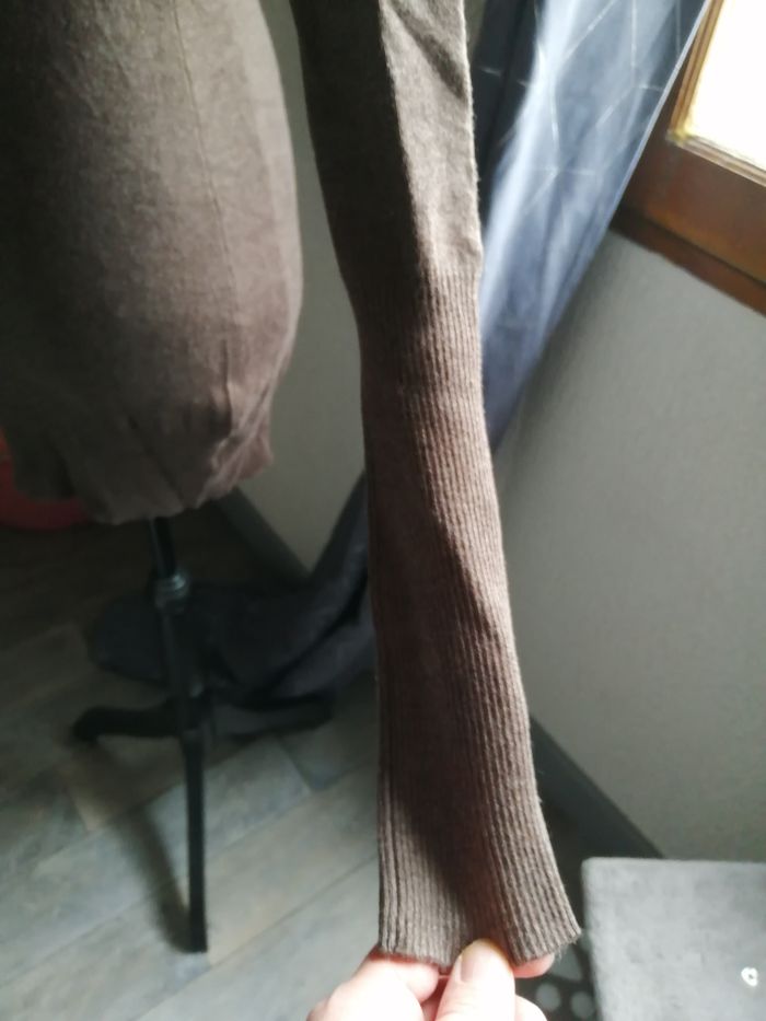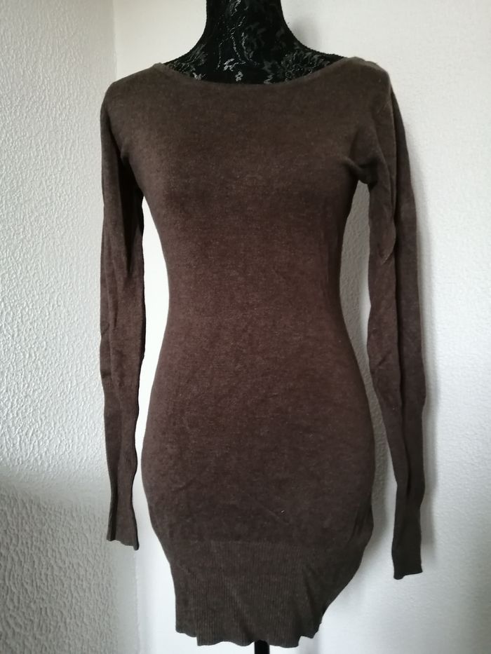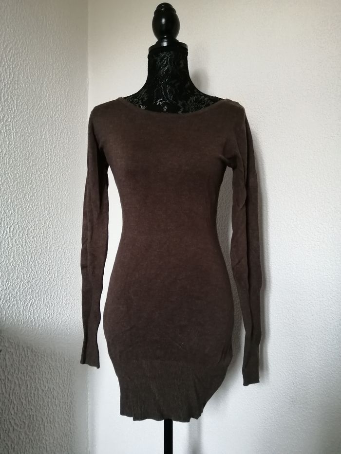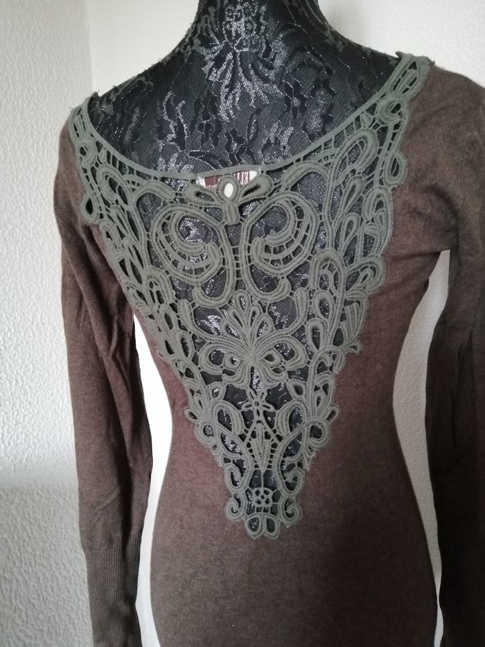 pull long ou robe moulante marron ras de cou avec dans le dos un très joli motif de dentelle