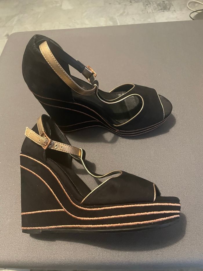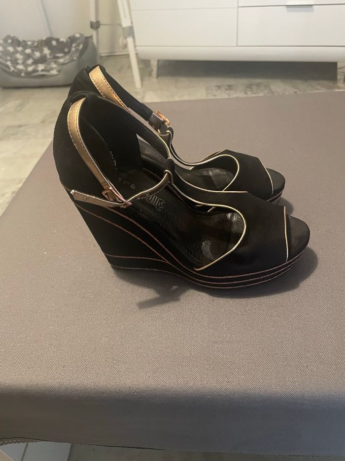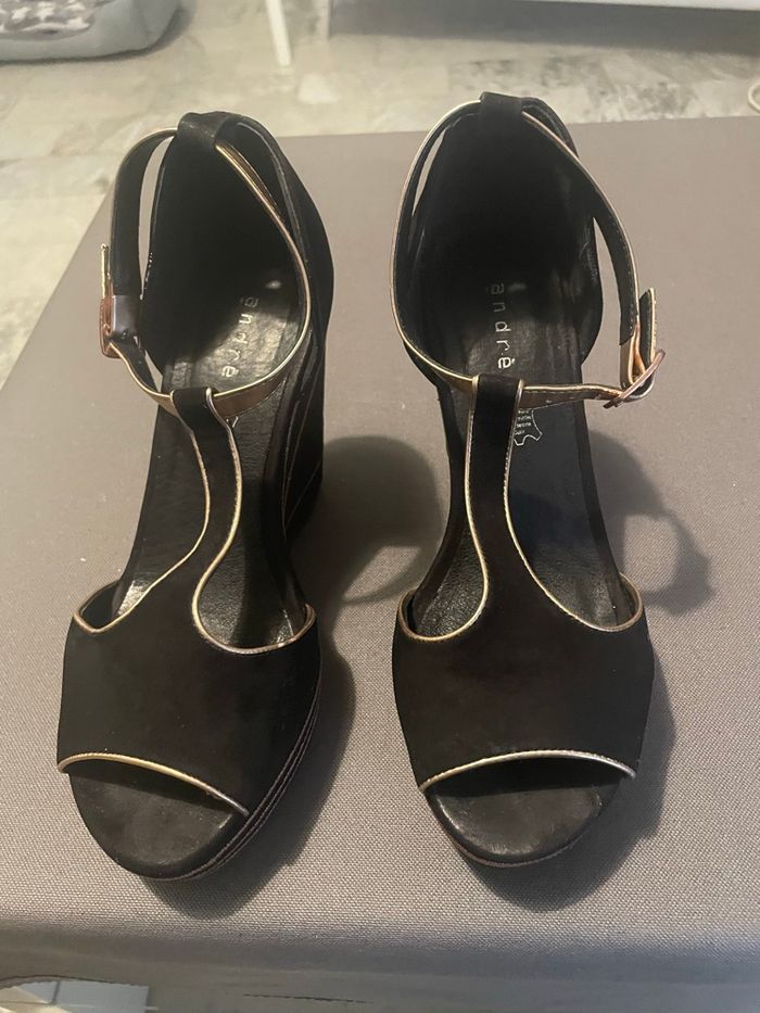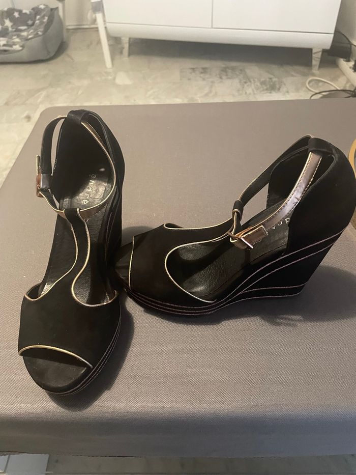 Escarpins compensés André en nubuck noir, élégants et confortables.