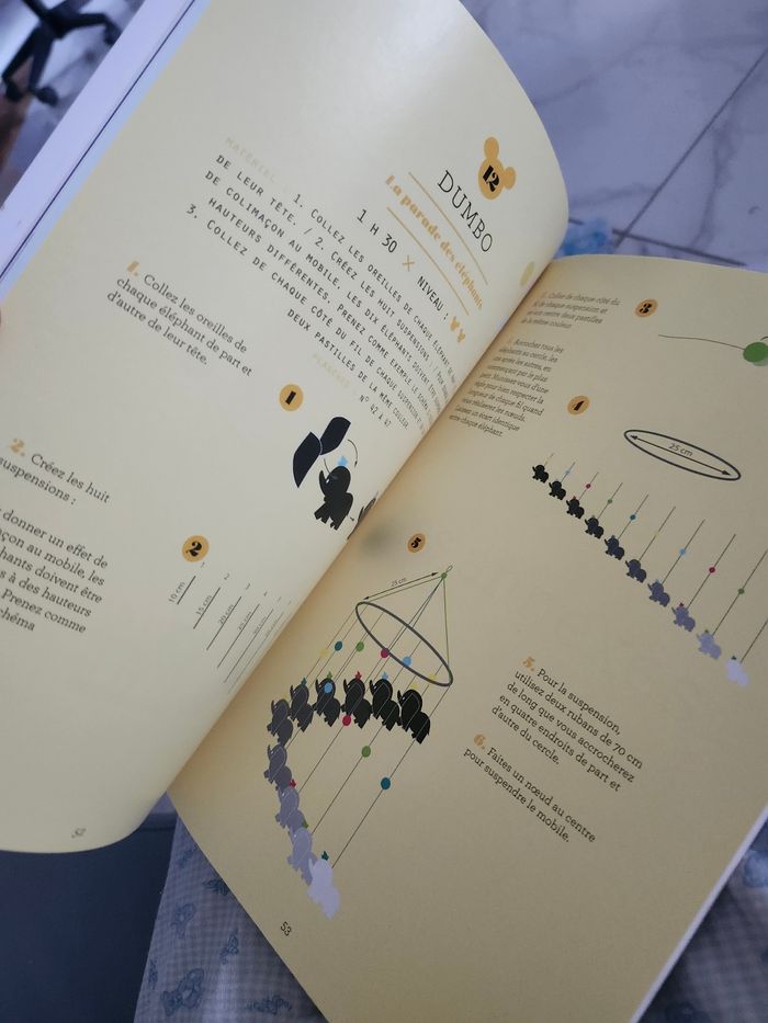 N’hésitez pas à faire des lots. ATTENTION L’ARTICLE EST NEUF MAIS JE NE COMPTE QUE 50 PLANCHES PREDECOUPEES. MOBILES ILLUSTRÉS EN PAS À PAS Découvrez dans cet ouvrage 12 modèles de mobiles inspirés par les plus magiques des univers Disney ! Envolez-vous au dessus de Londres avec Peter Pan ! Visitez le Pays des Merveilles avec Alice ! Grimpez à bord de la maison volante de Là-Haut ! CE KIT CONTIENT : • 1 livret de 96 pages détaillant les instructions entièrement illustrées en pas-à-pas • 60 planches cartonnées prédécoupées (47 PAGES + 2× la 11 + 2× la 12 + 2x la 17 = 50 PAGES )