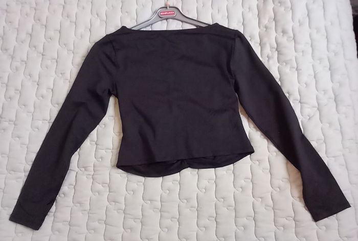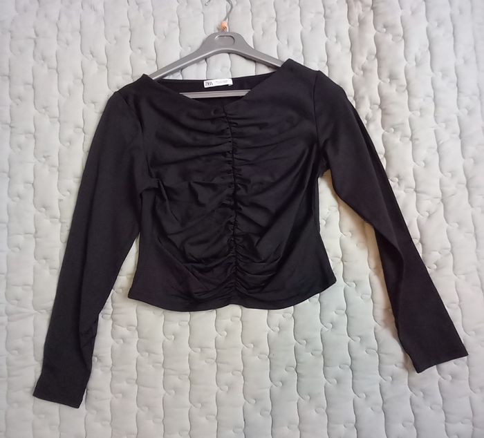 - Top Zara taille L manches longues, col évasé, coloris noir, élastique devant pour un effet plissé, 92% polyamide 8% élasthanne, largeur épaules 37 cm - aisselles 40 cm, Longueur épaule-bas 51 cm- aisselles-bas 32 cm longueur manches 57 cm