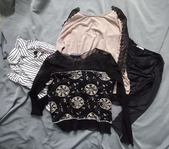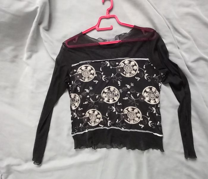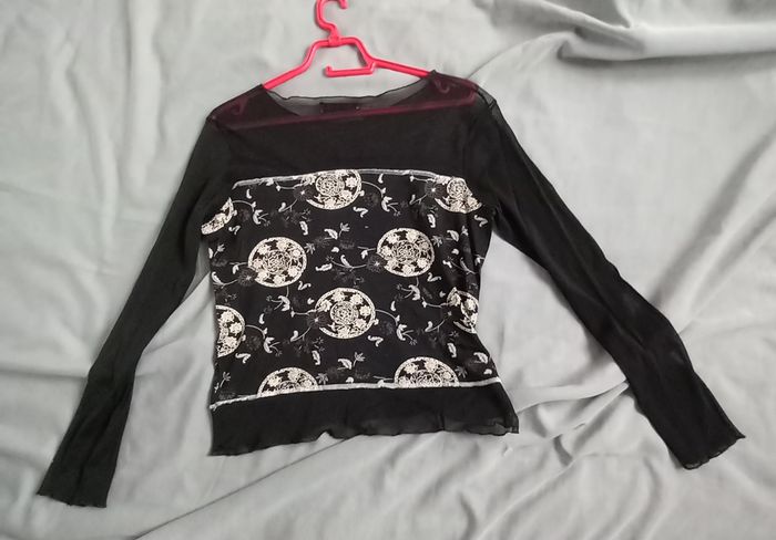 - Top manches longues La mode est à vous, tissu en transparence sur les épaules, dessin imprimé, coloris noir, étiquette de composition coupée, largeur épaules 42 cm - aisselles 49 cm Longueur épaule-bas 55 cm- aisselles-bas 36 cm longueur manches 57 cm