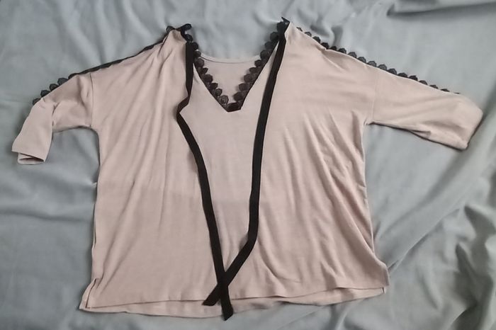- Pull Kiabi, manches 3/4, dentelle noir, coloris beige, attaches dans le dos pour 1 joli effet, étiquette de composition coupée, largeur épaules 55 cm - aisselles 67 cm Longueur épaule-bas 57 cm- aisselles-bas 41 cm longueur manches 27 cm
