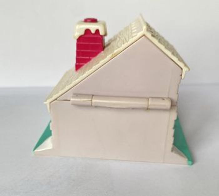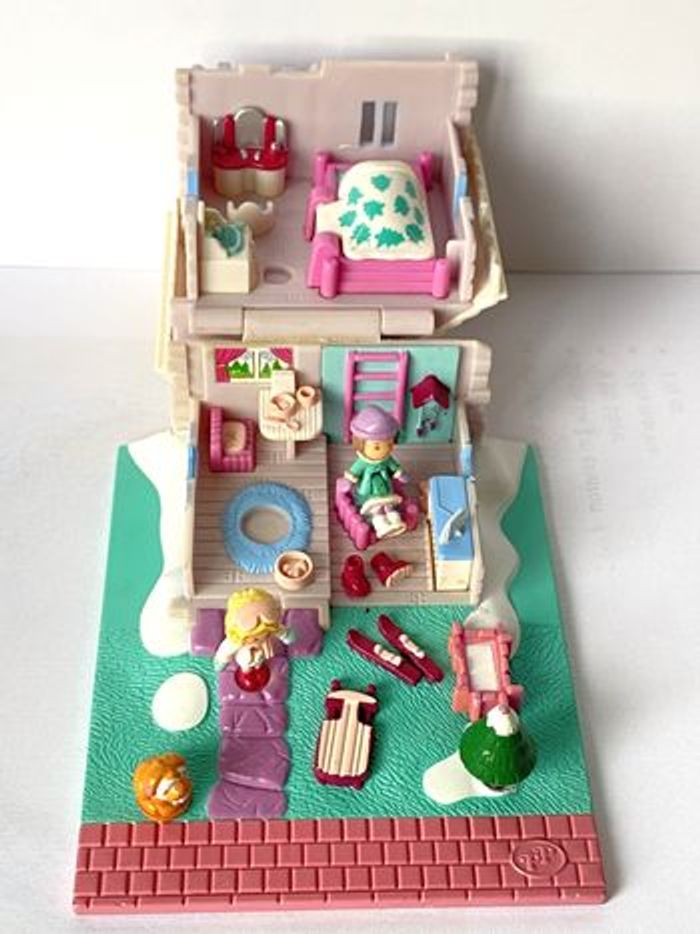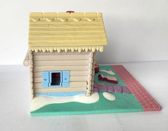Polly Pochet Bluebird Chalet de ski COMPLET. 2 figurines : Polly, Lulu, Benji le chien St Bernard et 1 sapin. Au vue de son âge, légère décoloration sur le toit du chalet. Le chalet ferme parfaitement.