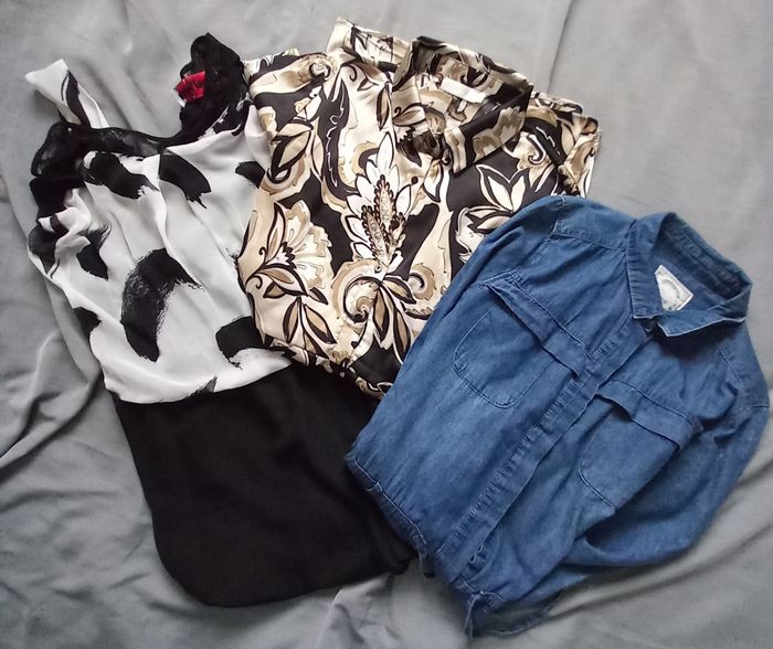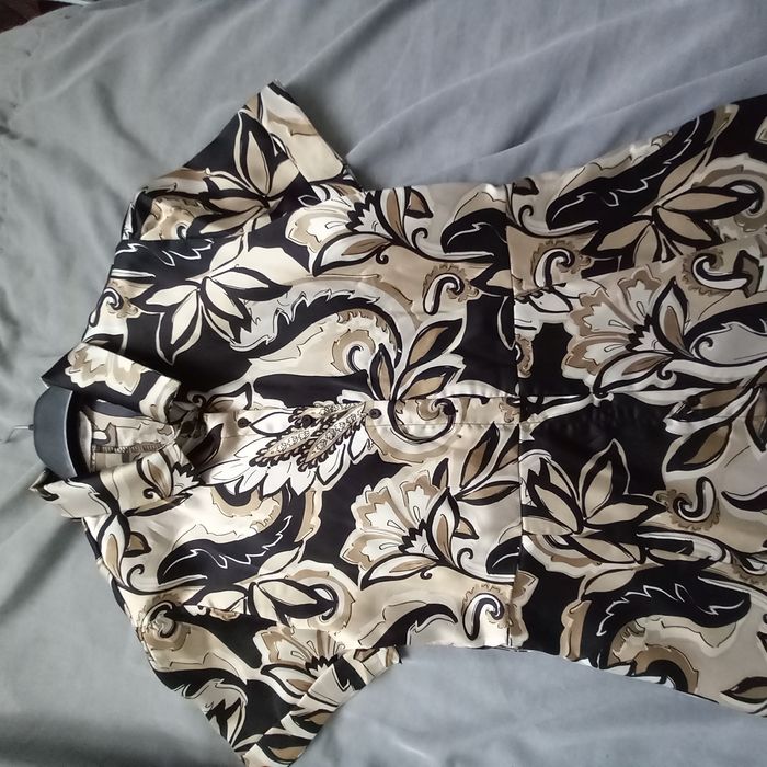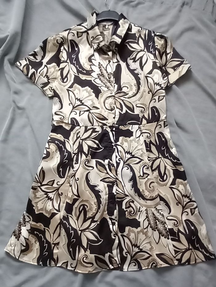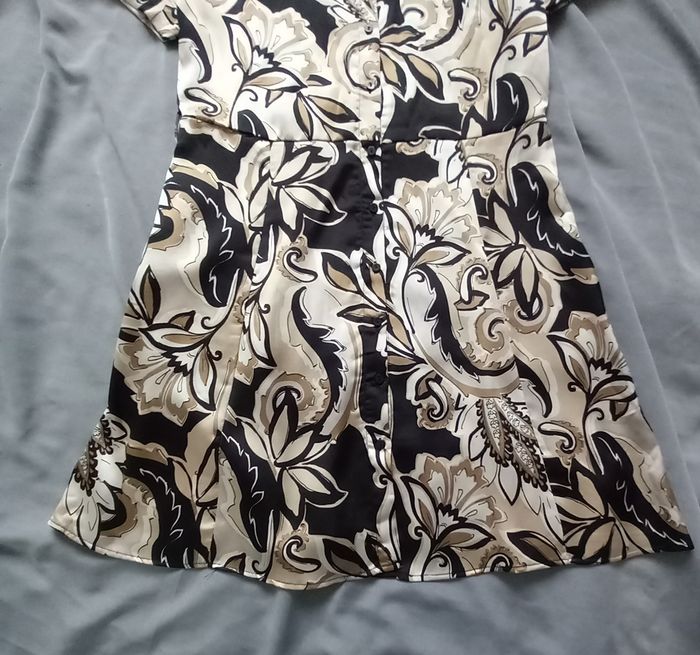 - Robe Flamant Rose, tissu satiné imprimé noir crème et beige, manches courtes avec revers, boutonnage,100% polyester, largeur épaules 38,5 cm - aisselles 49 cm Longueur épaule-bas 84 cm- aisselles-bas 64 cm