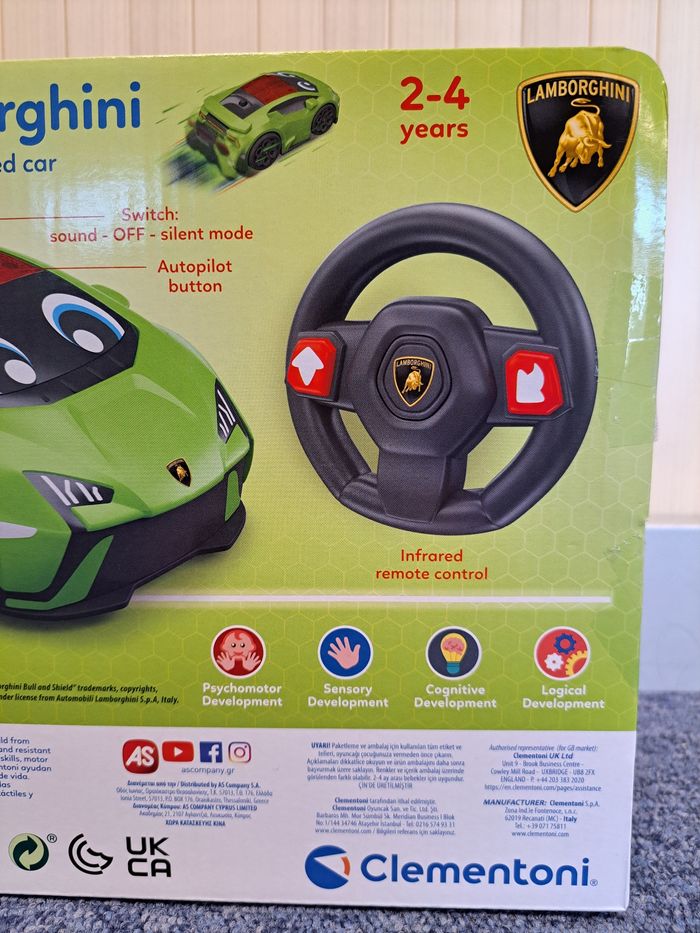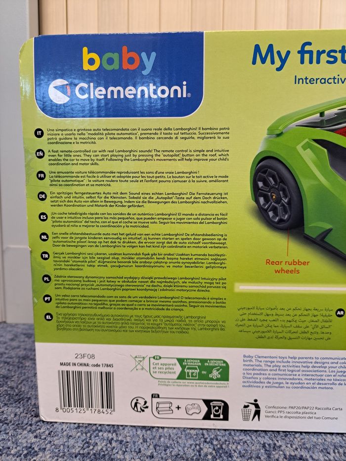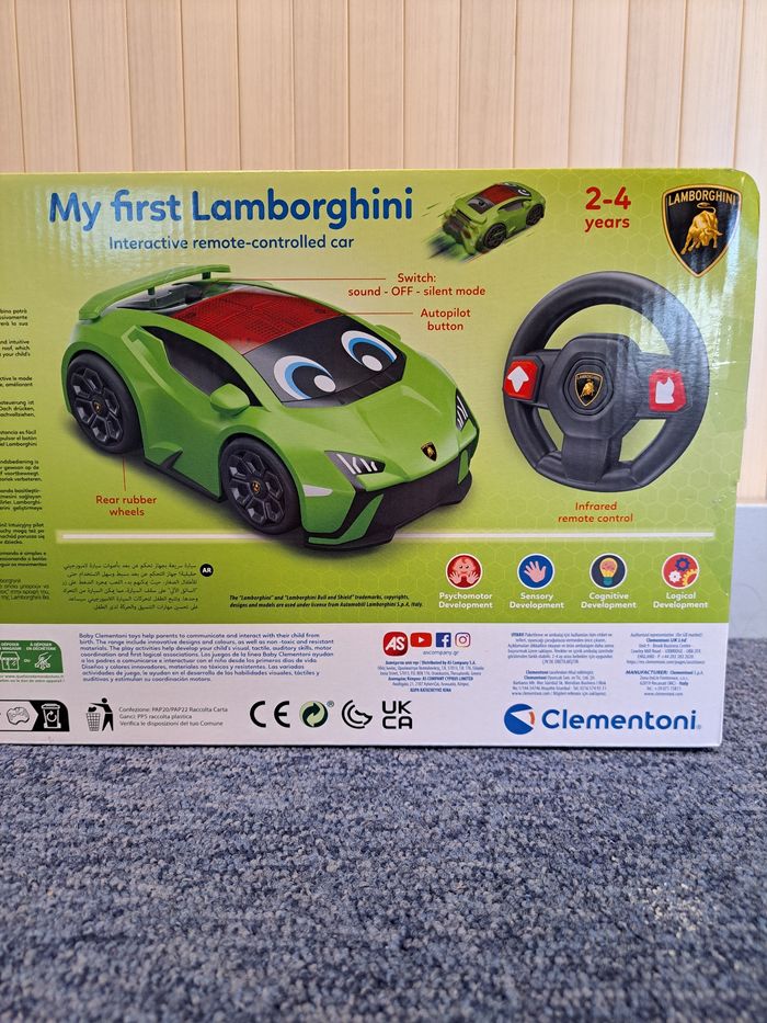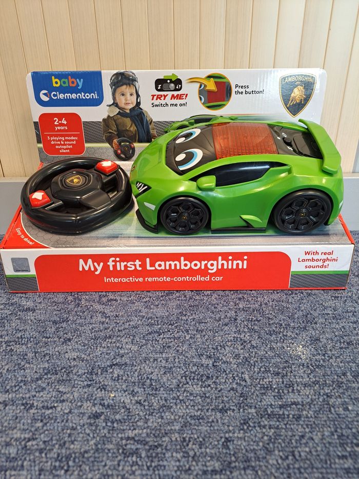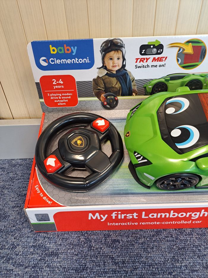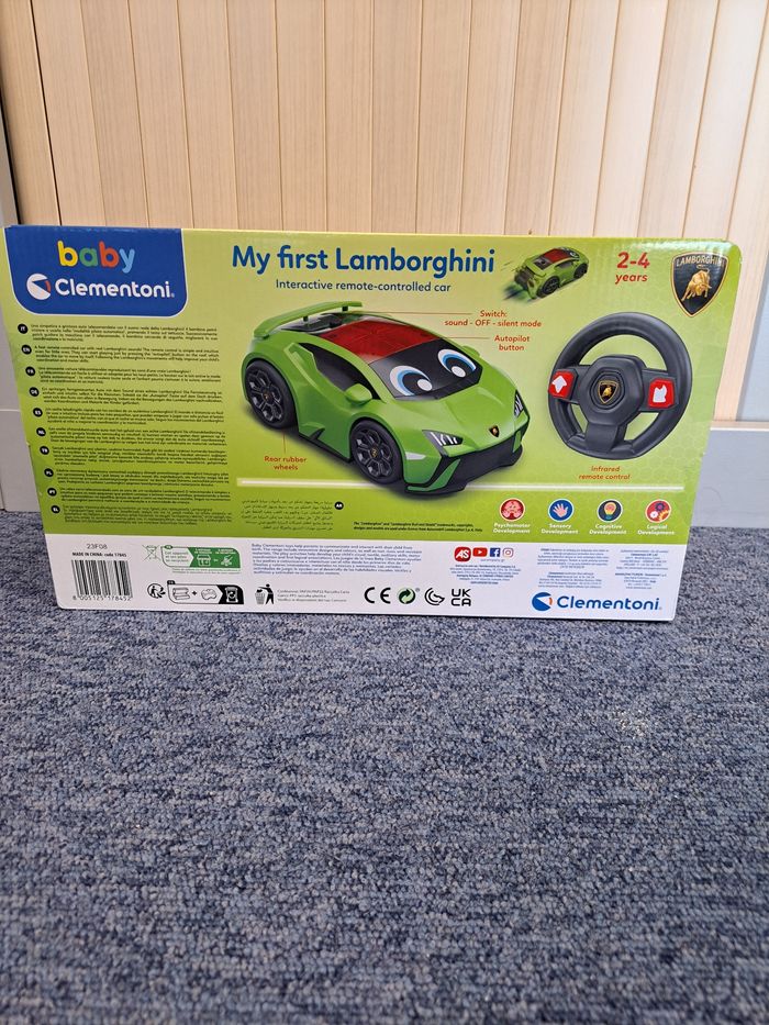 Absolument neuve, jamais sorti de sa boite. Idéal pour offrir ! Prix magasin = 39,90 euros • Il n'est jamais trop tôt pour avoir la voiture de ses rêves. Voici 'Ma première Lamborghini RC', un bolide télécommandé de Baby Clementoni ! • Grâce à la télécommande à infrarouges, l'enfant peut diriger la voiture à distance en toute simplicité. • L'enfant s'amusera à piloter la voiture, qui interagira avec de nombreux sons réalistes. • Le jouet stimule la coordination œil-main. En tentant de suivre la voiture, l'enfant pourra parfaire sa motricité.