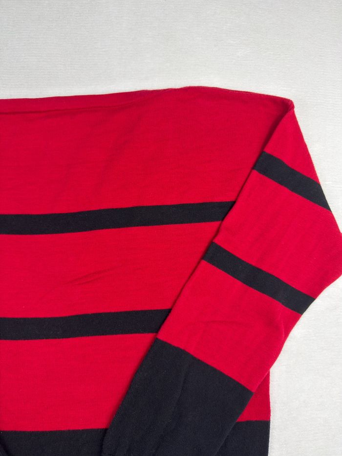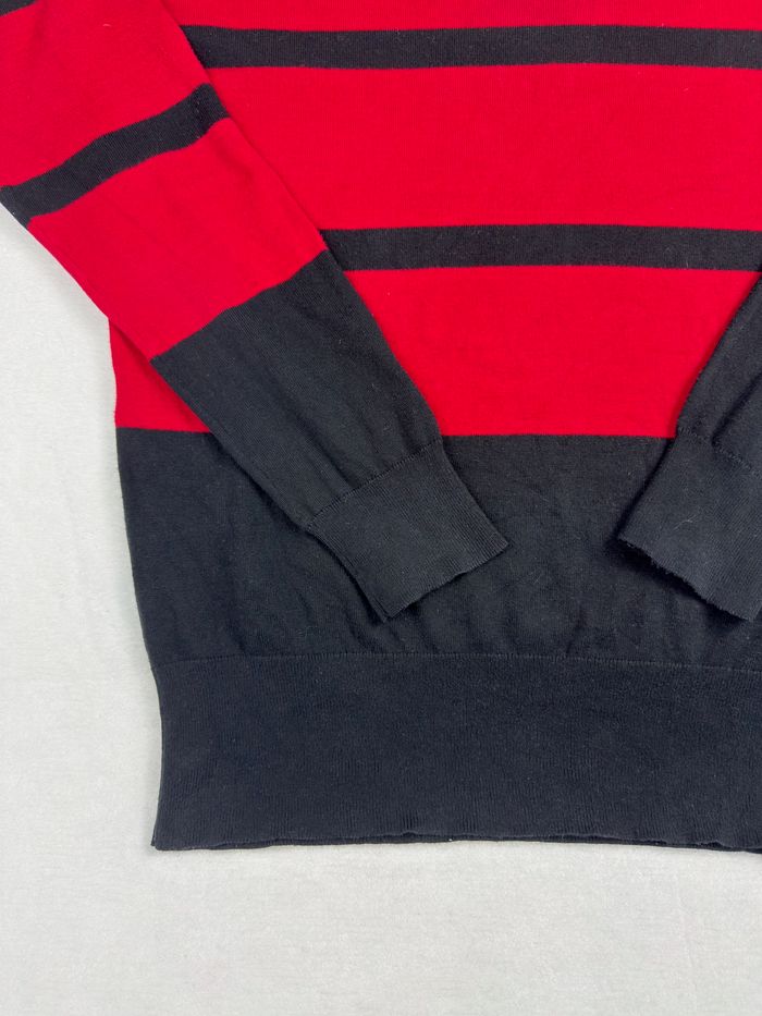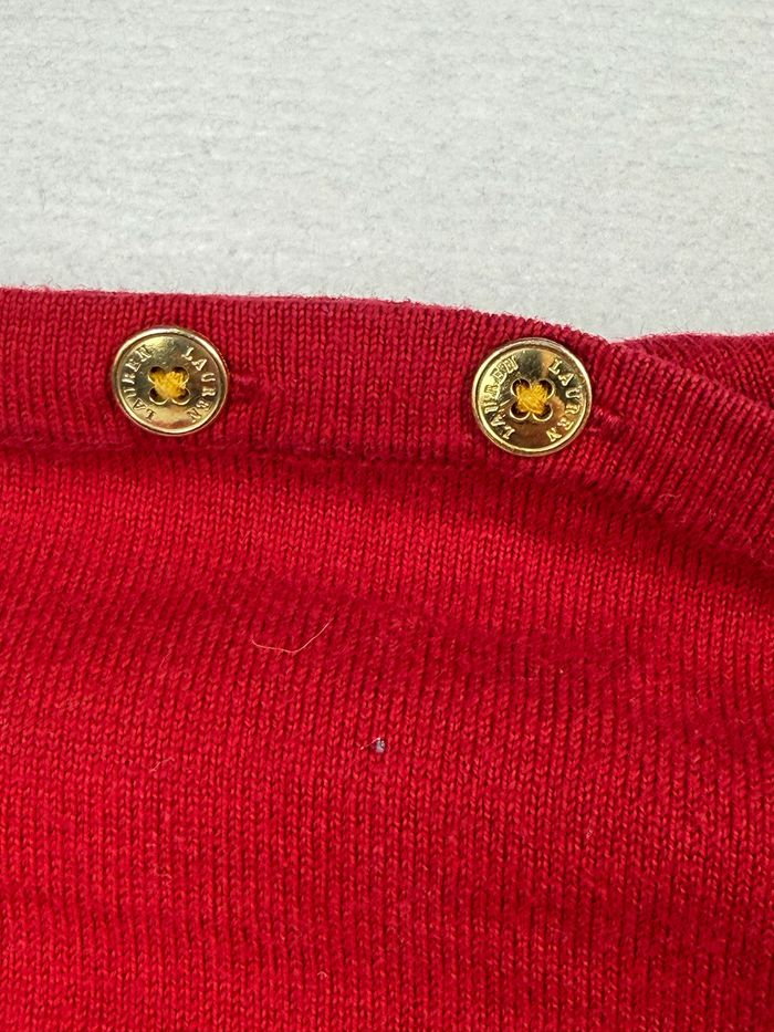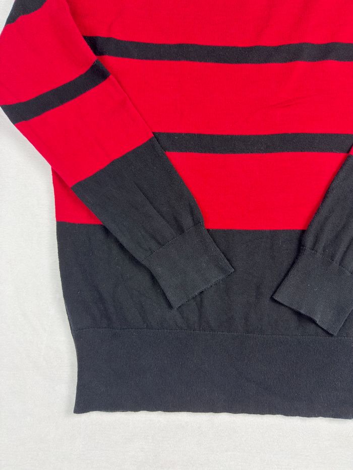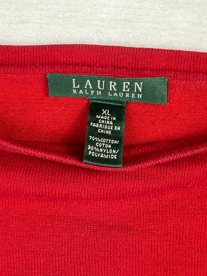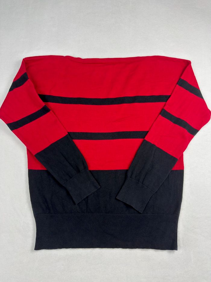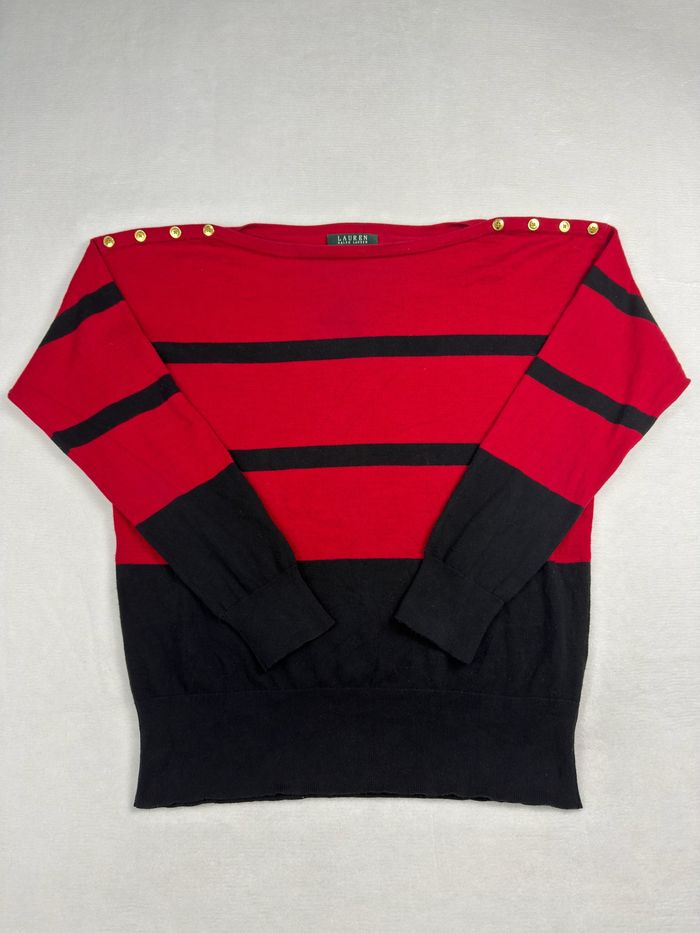 👕 Pull Lauren Ralph Lauren premium rayé rouge et noir, taille XL, avec boutons dorés décoratifs vintage chic aux épaules. Matière agréable, coupe classique et élégante, idéale pour un look vintage chic. Très bon état général.