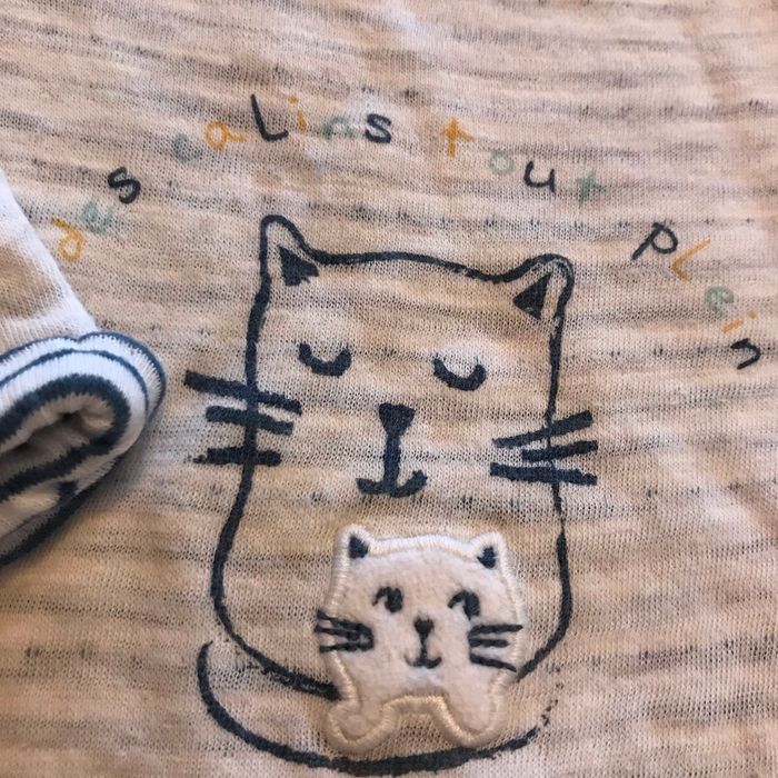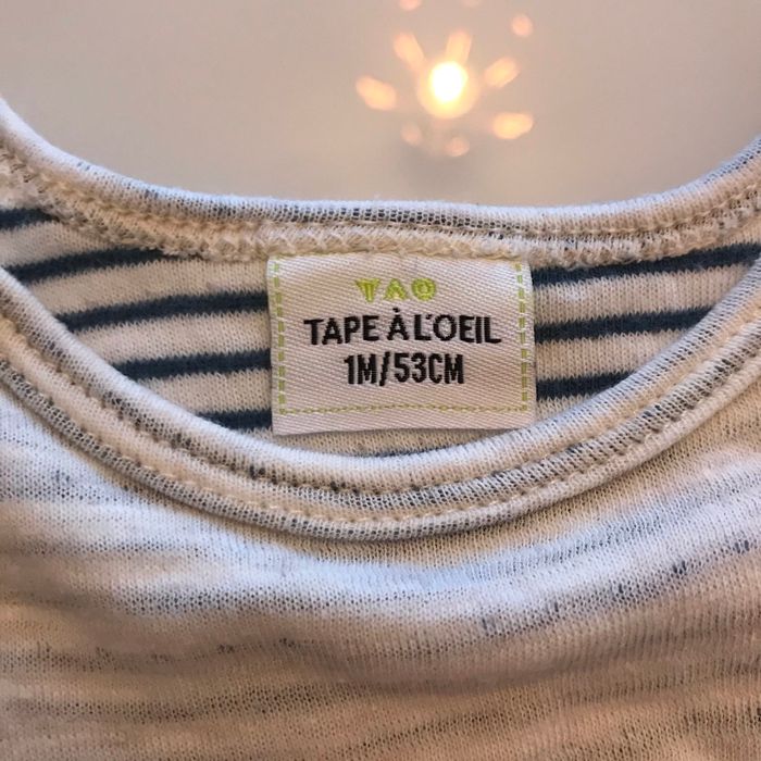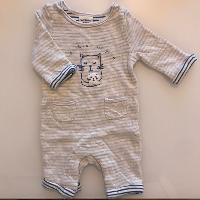 Combinaison coton taille 1 mois beige finitions rayures bleues ; Ouverture entre jambe pour le change ; Ouverture arrière col pour le passage de la tête.