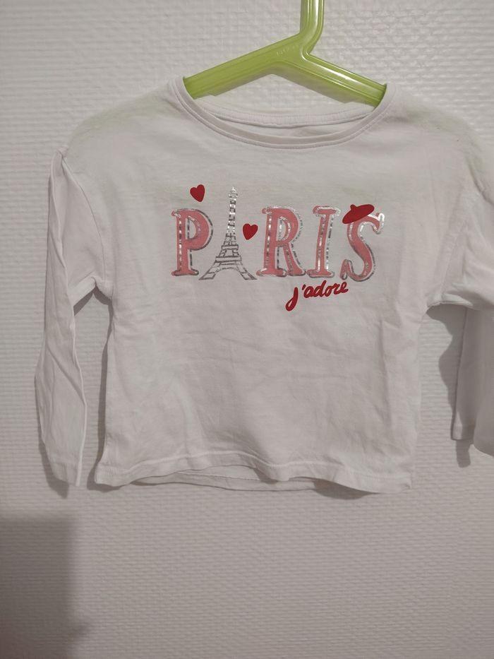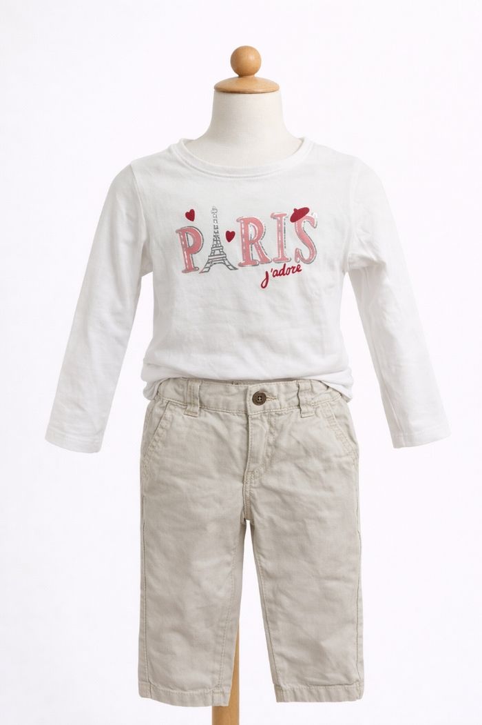 Joli ensemble pour fille composé d’un tee-shirt blanc manches longues motif “Paris j’adore” et d’un pantalon beige assorti.