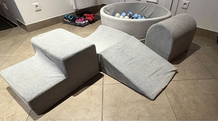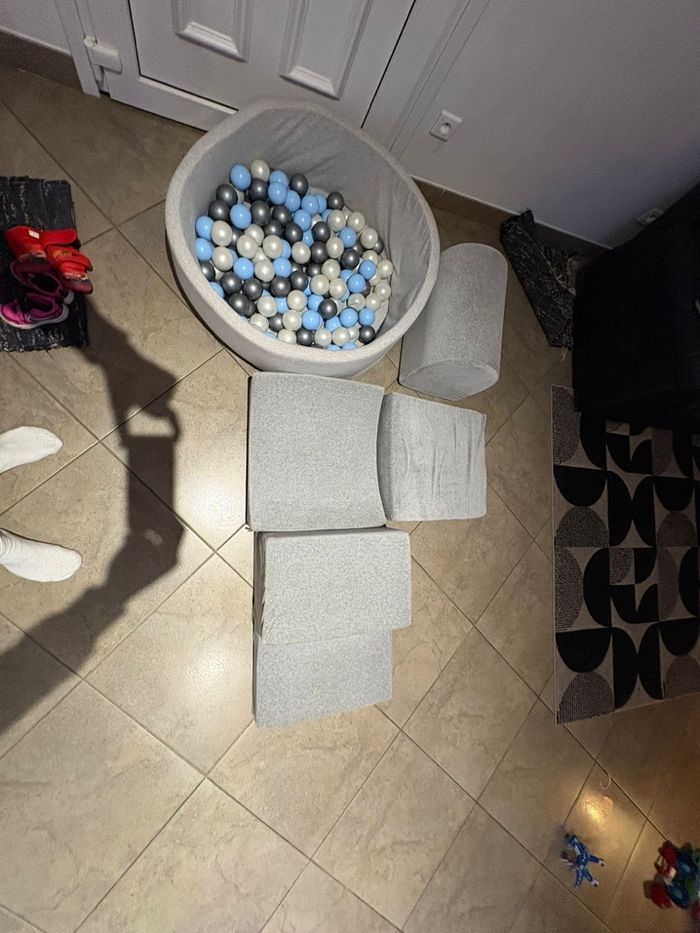 Le lot comprend un parcours avec 4 modules et une piscine à balle ronde avec balles bleu blanche et argent