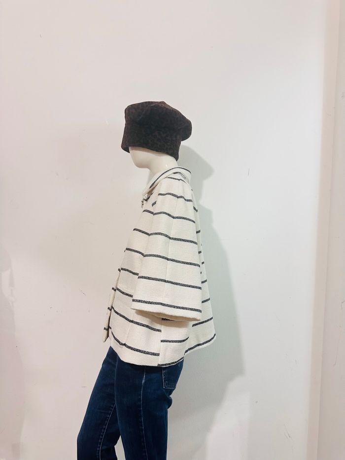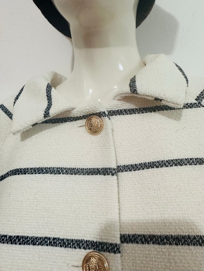Couleur écru avec fines rayures noires, boutons dorés élégants.